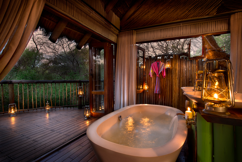 The dining area is in the main lodge where brunch and high tea are served. Dinners are usually around a fire under the African stars if the weather is suitable. Menus feature fresh, seasonal South African produce and meats. A large fireplace separates the lounge and bar area from the dining room and the quaint curio shop. Tree Lodge guests have access to a swimming pool surrounded by comfortable loungers, perfect for relaxing on after a refreshing swim.