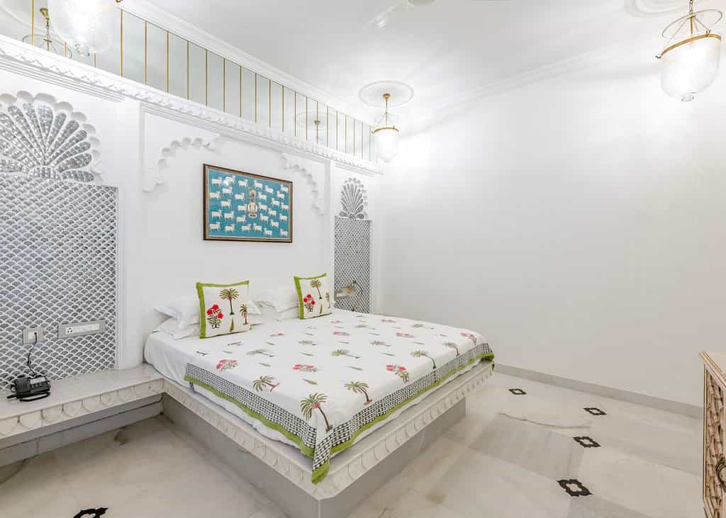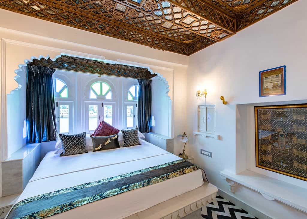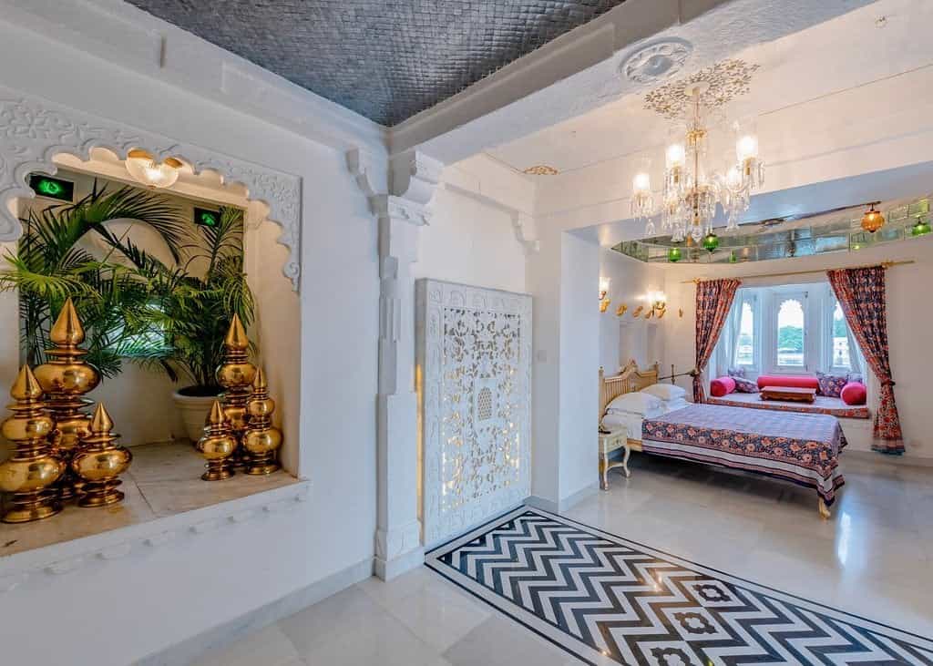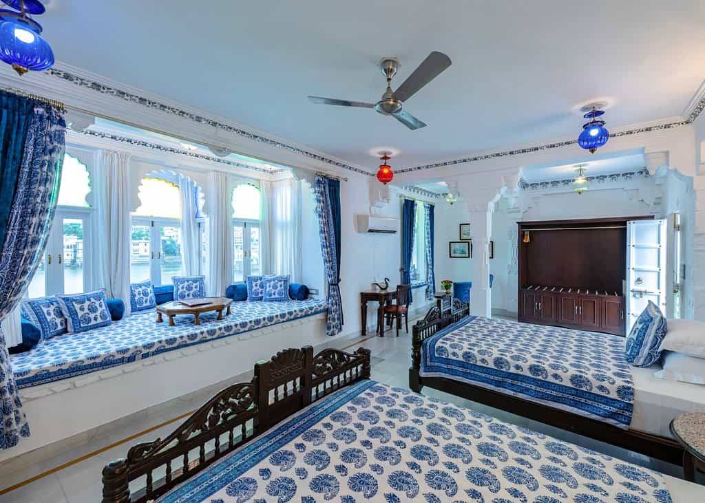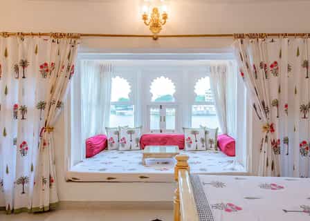 The palace has a variety of rooms from the lake-view suites and Heritage rooms to haveli and standard rooms, most of which have a view of the courtyard. Classy palettes of cream and white alongside decorated frescoes adorn each room. The beds are laid out with floral prints and some rooms come with decorative touches like a chandelier and multi-coloured windows. Lovely balconies and cushy window seats make for the perfect place to enjoy the view.