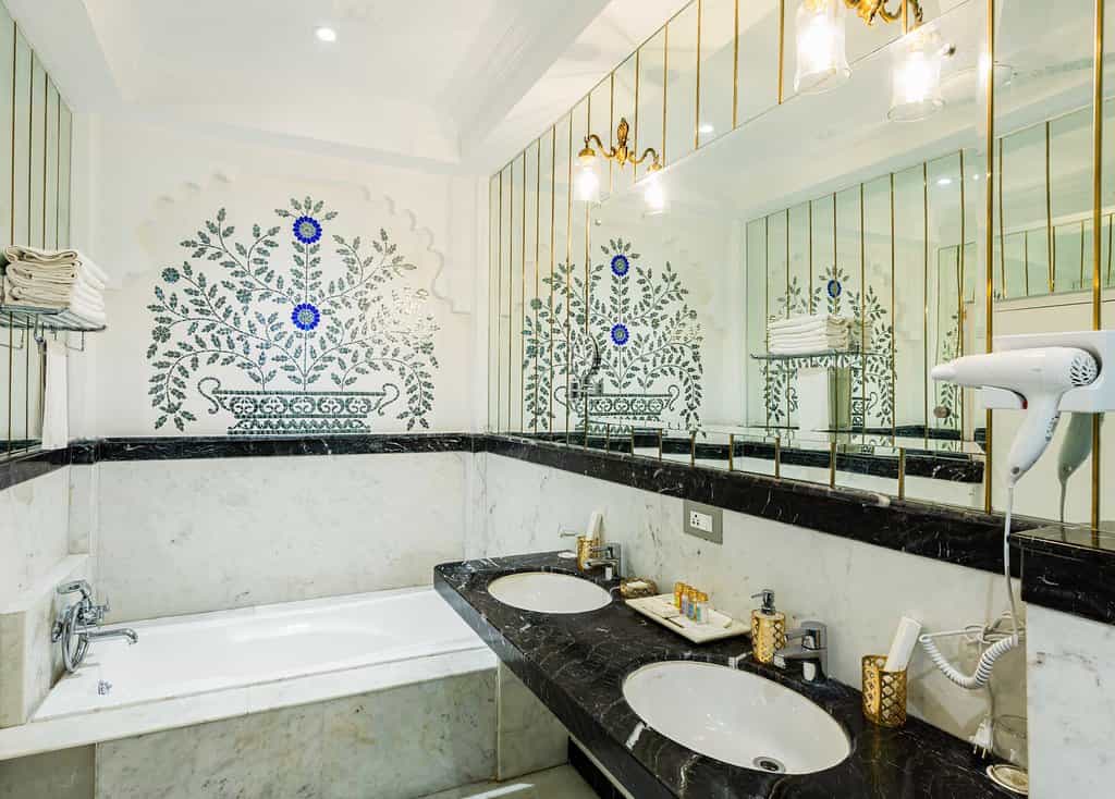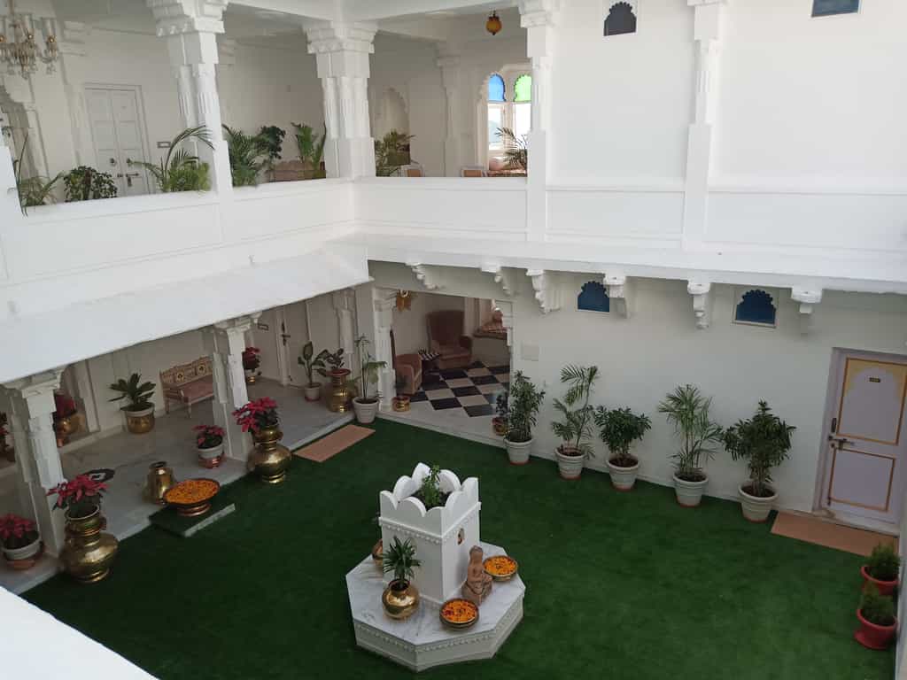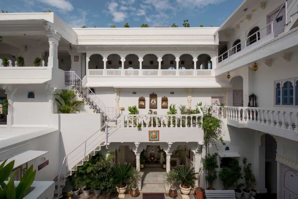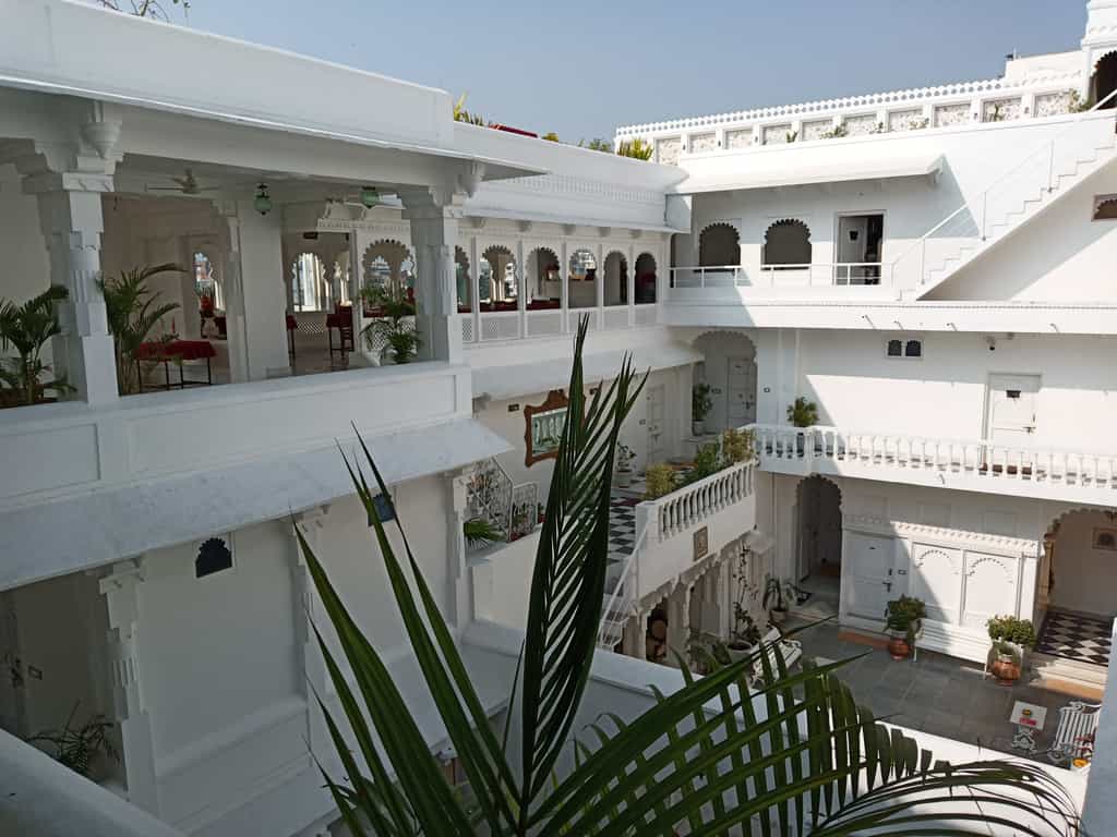 The palace has a variety of rooms from the lake-view suites and Heritage rooms to haveli and standard rooms, most of which have a view of the courtyard. Classy palettes of cream and white alongside decorated frescoes adorn each room. The beds are laid out with floral prints and some rooms come with decorative touches like a chandelier and multi-coloured windows. Lovely balconies and cushy window seats make for the perfect place to enjoy the view.