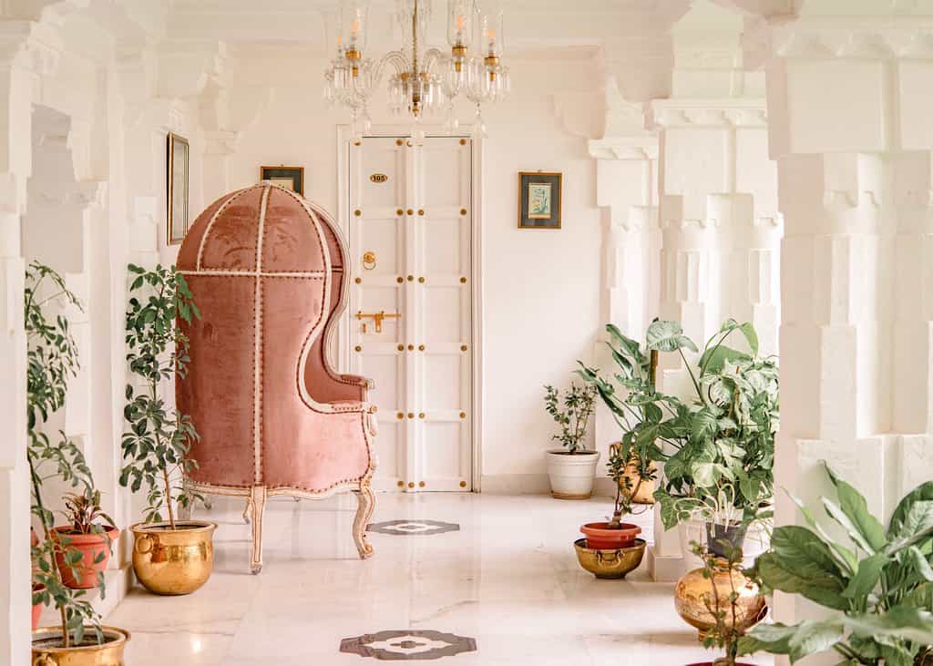 On Jagat's lovely rooftop, you'll find Chandni, which serves up traditional Rajasthani cuisine as well as more continental fare. At Jharoka, you can enjoy a range of dishes in beautifully carved nooks or airy corridors complete with ceiling frescoes. Keeping up with the rooftop theme, the hotel also has an idyllic pool (with a view!) and for extra relaxation, head to the spa for a dreamy Ayurvedic massage. With colourful trimmings throughout, the palace has lovely artistic touches like a golden lotus mural, royal portraits and eclectic furnishings.