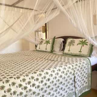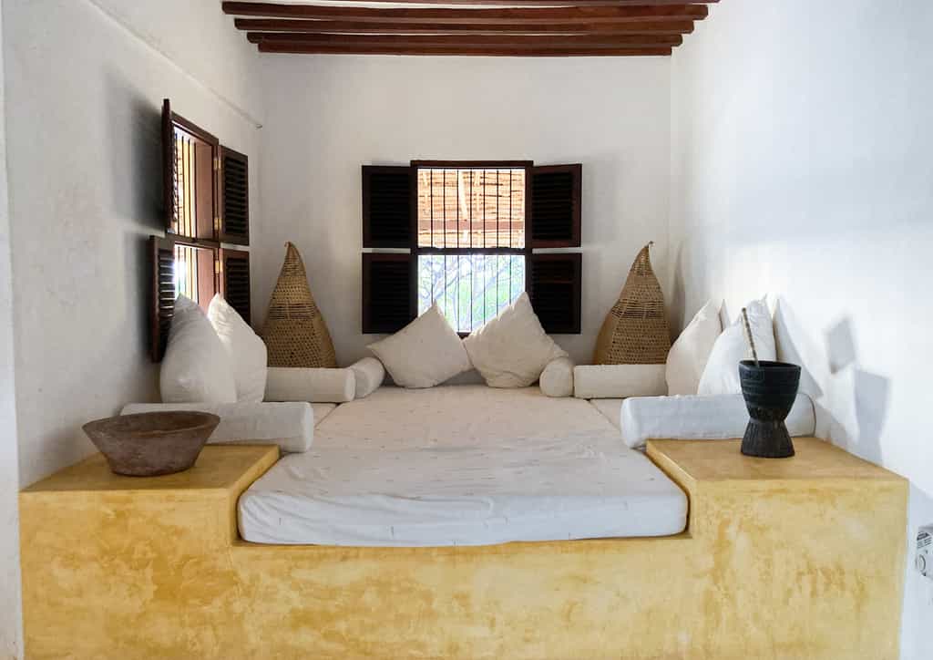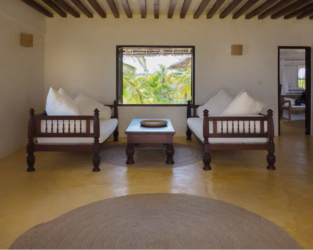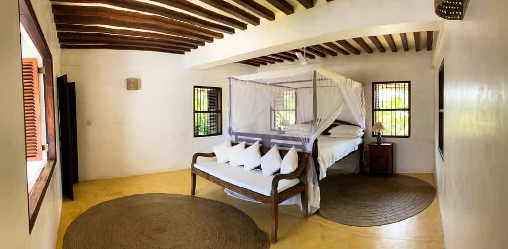 Leading off the inner courtyard are four double bedrooms with en-suite bathrooms. On the roof is a cool and spacious master wing, with a private library and bedroom, en-suite dressing room and bathroom area. All rooms are white-washed, with traditional wooden four-poster Swahili beds and private verandas furnished with antique Lamu daybeds, quaint little writing desks and colourful decorative accents.