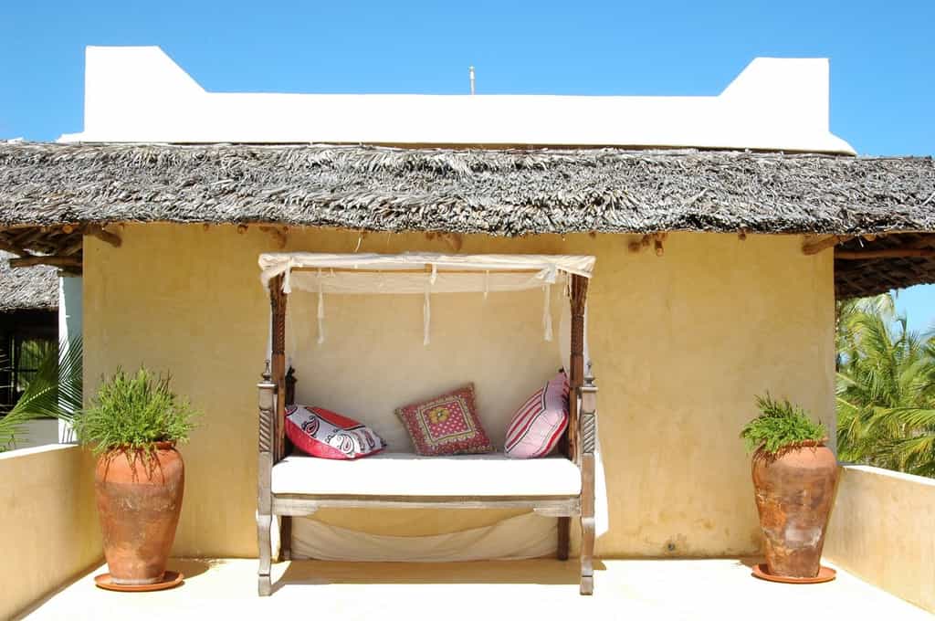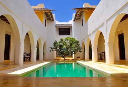 Jahazi is built in traditional Kenyan architectural style around an inner courtyard with, at its heart, a discreet swimming pool that cools the public rooms and bedrooms. Yellow-tinted archways surround the pool, which is open to the sky to let in the light. The entry hall has a baraza (meeting place) area, a plush, vibrant-cushioned daybed and a wooden carved table. The roof is one huge, partly shaded terrace, with a bar and lovely eating and sitting areas.