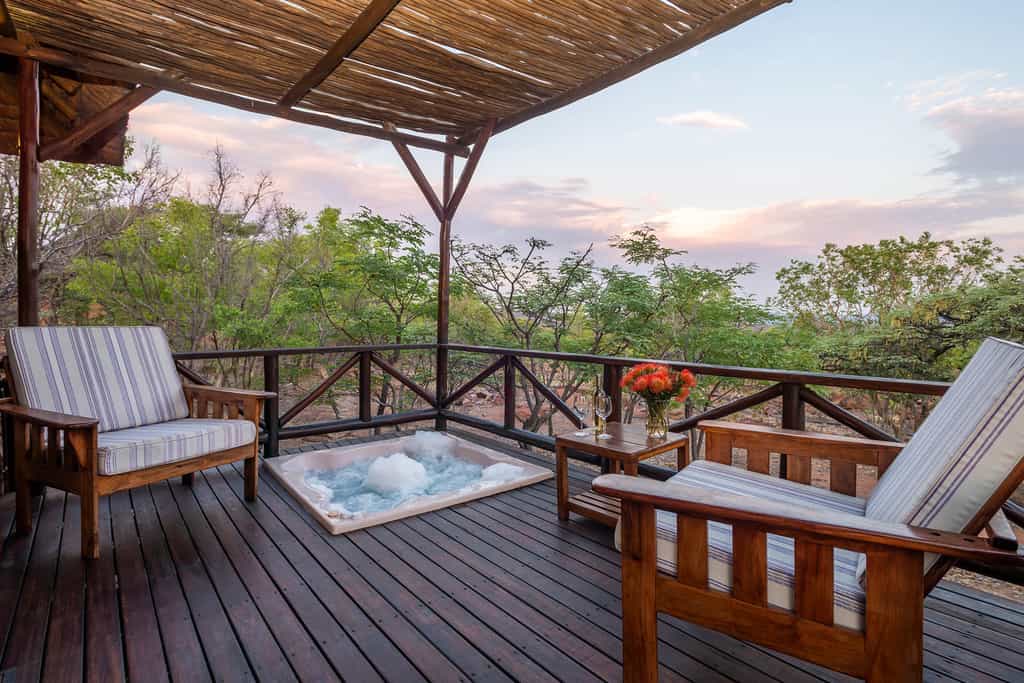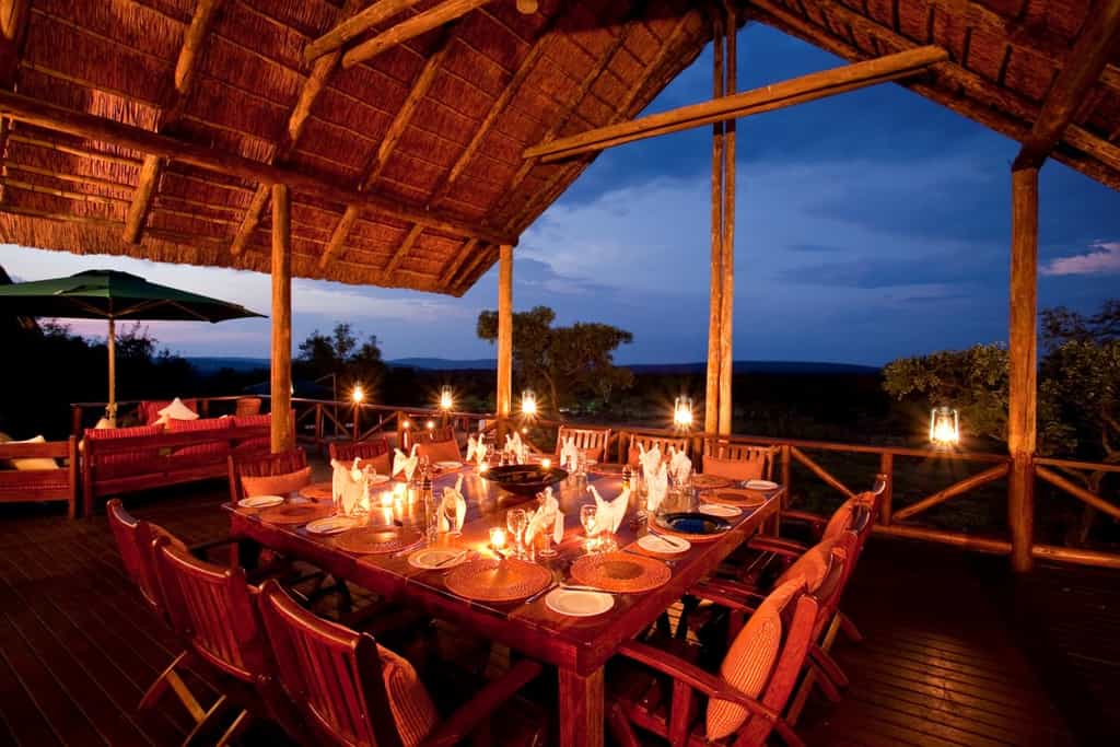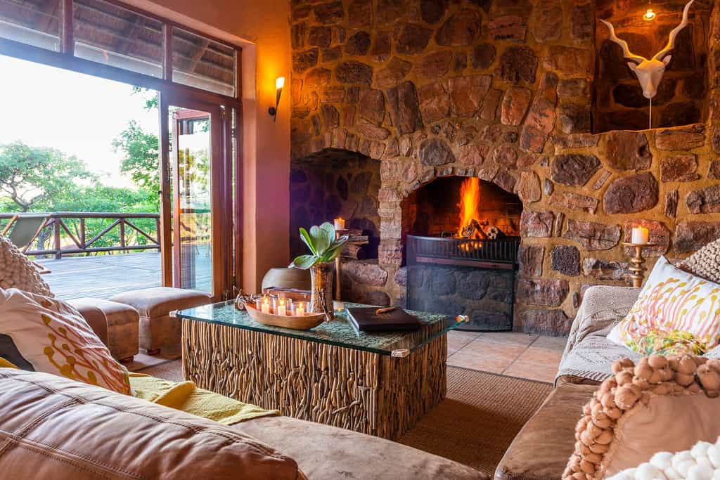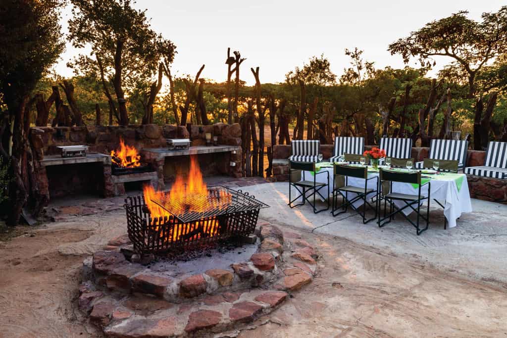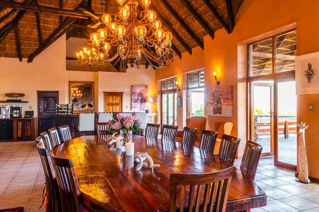 Sitting in a cluster of acacia trees, the lodge commands sweeping views of the plains and escarpment, and most immediately, an active waterhole. Constructed of cement and stone with a packed-thatch roof, the structure has ample interiors, fringed by a generous deck that hosts meals beneath its peaked roof. The lounge is cozily arranged with a cluster of sofas and chairs around a stone hearth. An indoor dining room seats guests at one long table, enchantingly lit by a low-hanging chandelier.