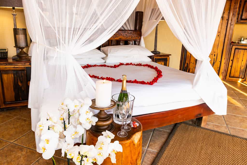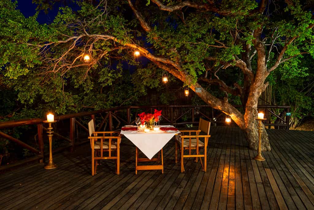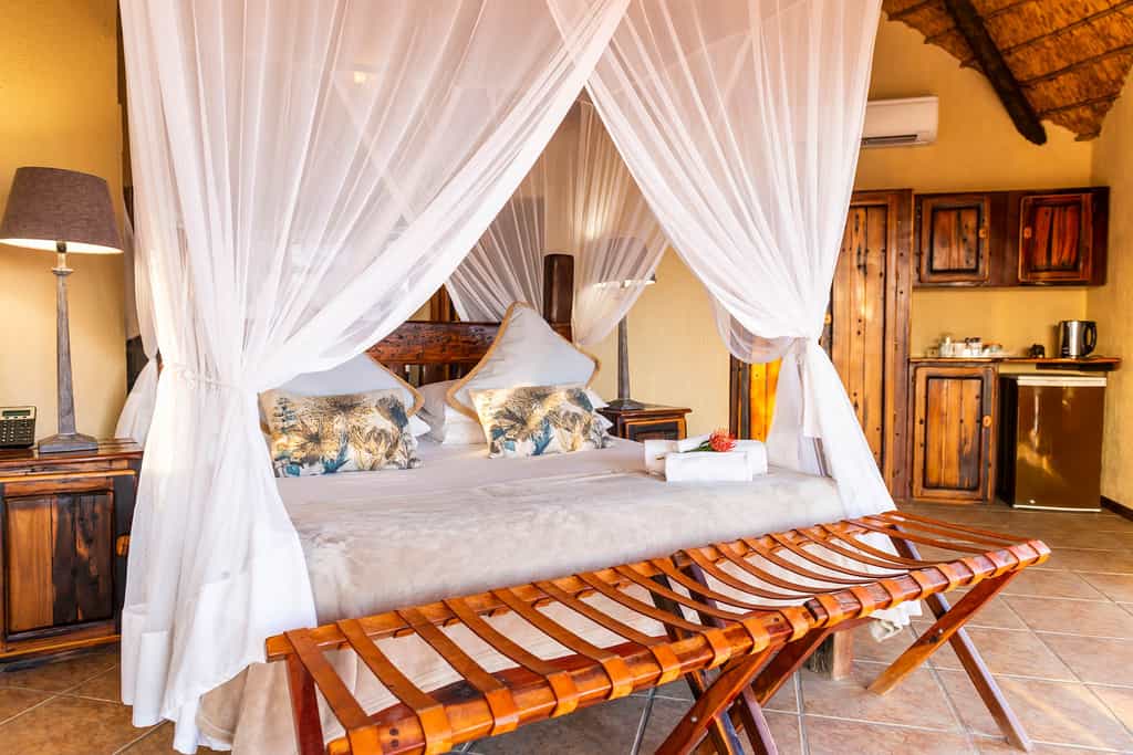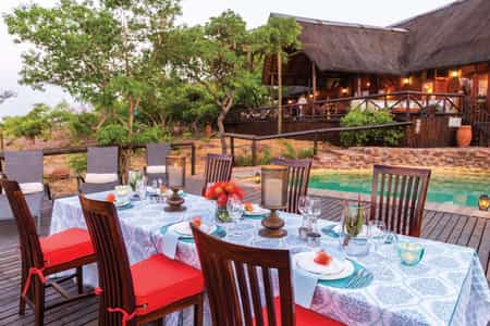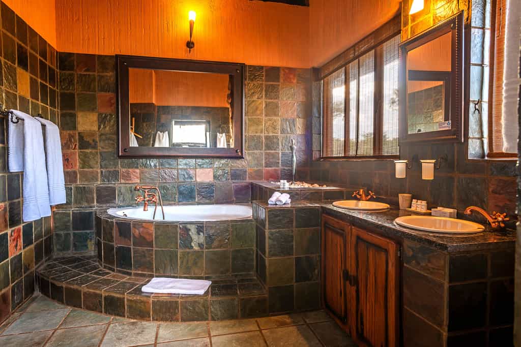 Sitting in a cluster of acacia trees, the lodge commands sweeping views of the plains and escarpment, and most immediately, an active waterhole. Constructed of cement and stone with a packed-thatch roof, the structure has ample interiors, fringed by a generous deck that hosts meals beneath its peaked roof. The lounge is cozily arranged with a cluster of sofas and chairs around a stone hearth. An indoor dining room seats guests at one long table, enchantingly lit by a low-hanging chandelier.