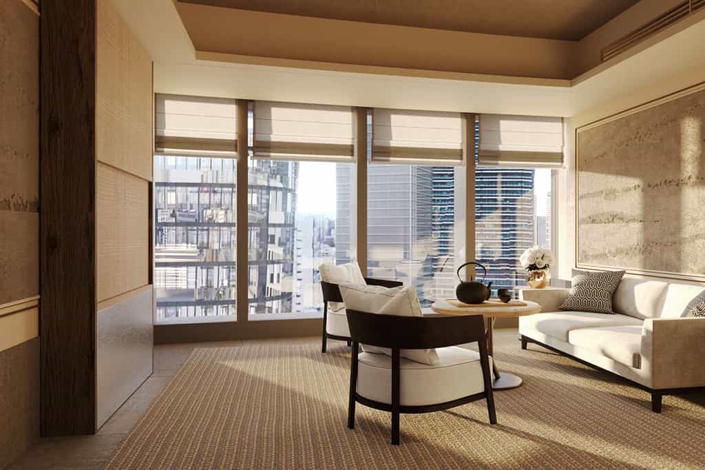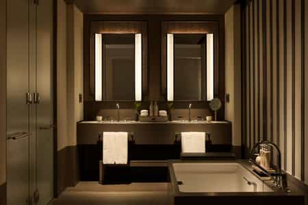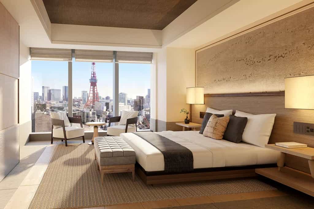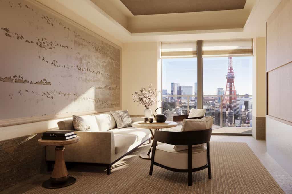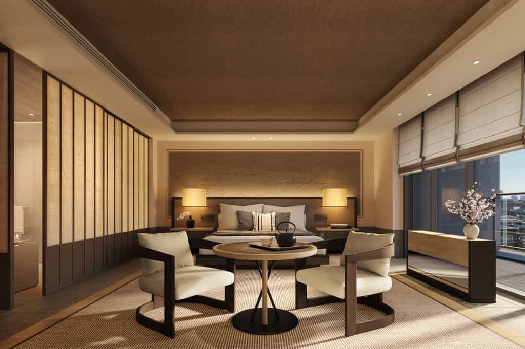 Spanning eight storeys, Janu has 122 light-filled rooms and suites, all of which have floor-to-ceiling windows displaying splendid views of Tokyo Tower and the city. They range in size from 55 to 284 square metres and the largest is the Janu Suite, which boasts two balconies, a private study, full kitchen and dining area and walk-in closet. The rooms all feature a king-sized bed as well as a spacious bathroom with a rain shower and enormous bath tub. Their aesthetic is minimalist and elegant, blending an Asian and European flair.