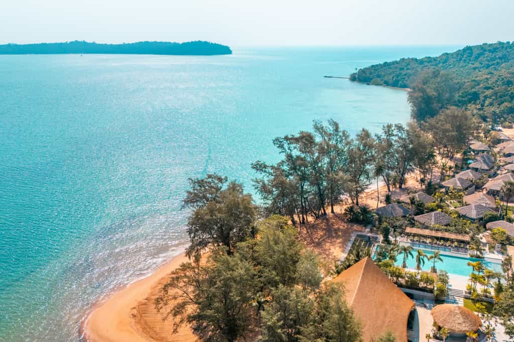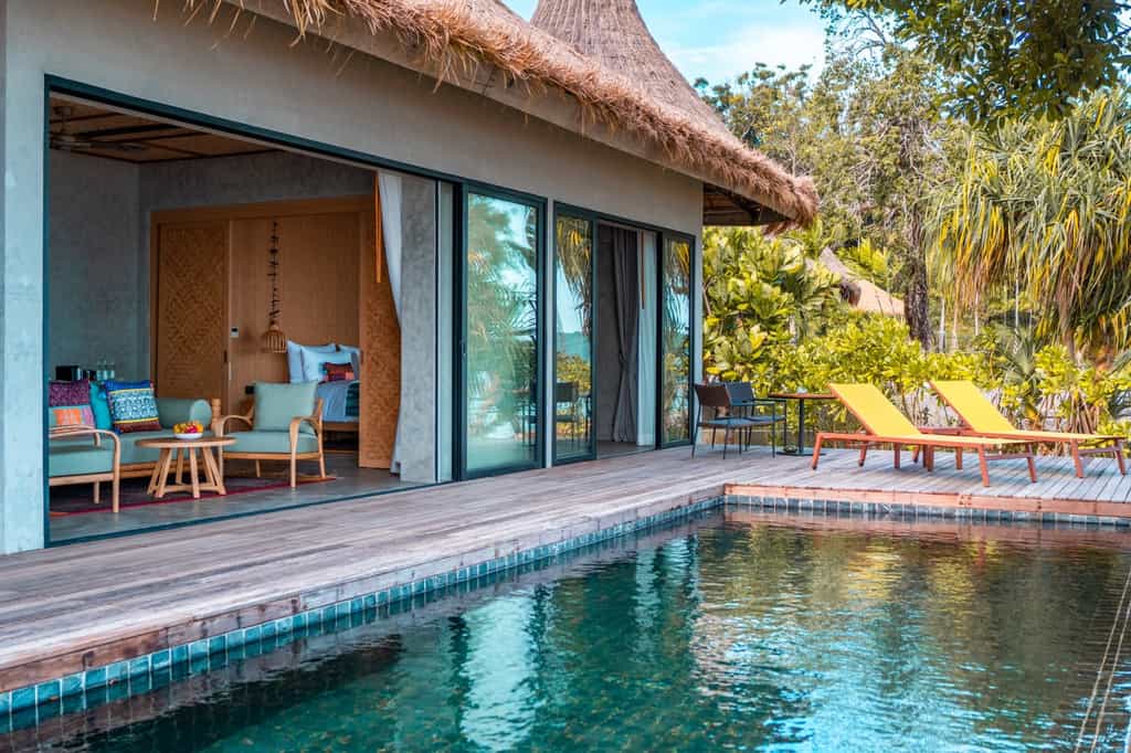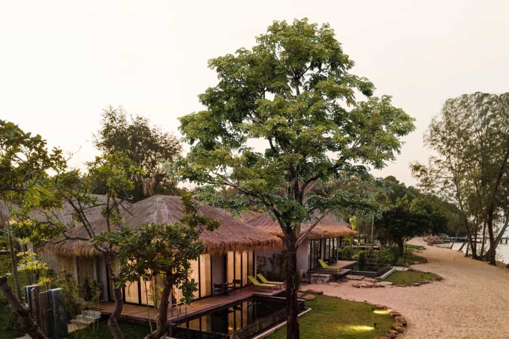 Barely off the golden shoreline, Koh Russey has a collection of air-conditioned villas and pavilions, with a mod and minimalist style. Walls of glass let in the idyllic view and an open-plan design means the bedroom (with a luxe king-sized bed) flows into the bathroom, which comes with a rainfall shower and alfresco tub. The one to four-bedroom villas are larger with a lounge in honey-coloured wood, and some have a dining area, kitchenette or private pool and cabana overlooking the sea.
