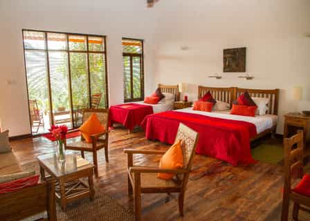With traditional peaked roofs and wrap-around verandas, Jim's Farm has a trio of villas. In the foyer, there are rattan planters chairs and plenty of whirring ceiling fans. Meals are served in the Mango Villa, where you'll tuck into breakfasts of fresh fruit, homemade jams and egg hoppers, and enjoy traditional Sri Lankan dinners. Ask the chefs and they'll share a few secrets too! Visit the Bamboo Spa for a much-needed massage and recline poolside on the moss-green loungers. The, at sunset, head to the yoga pavilion for a class as the sky turns orange, pink and indigo.