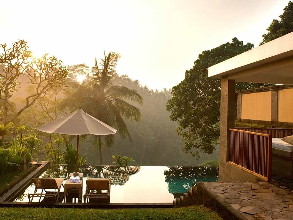 Surrounded by emerald rice terraces, Kamandalu was built to respect its surroundings and characterised by natural stone finishes and grass rooftops. The resort has a number of dining options: try Alun-Alun for romantic dinners, Petulu for authentic Indonesian cuisine, or the Awana Lounge for a healthy menu of seasonal fruits and veggies grown in the highlands. There are multiple pools to choose from (including one with a swim-up bar) as well as two spas, the Chaya private villa and Forest Spa.