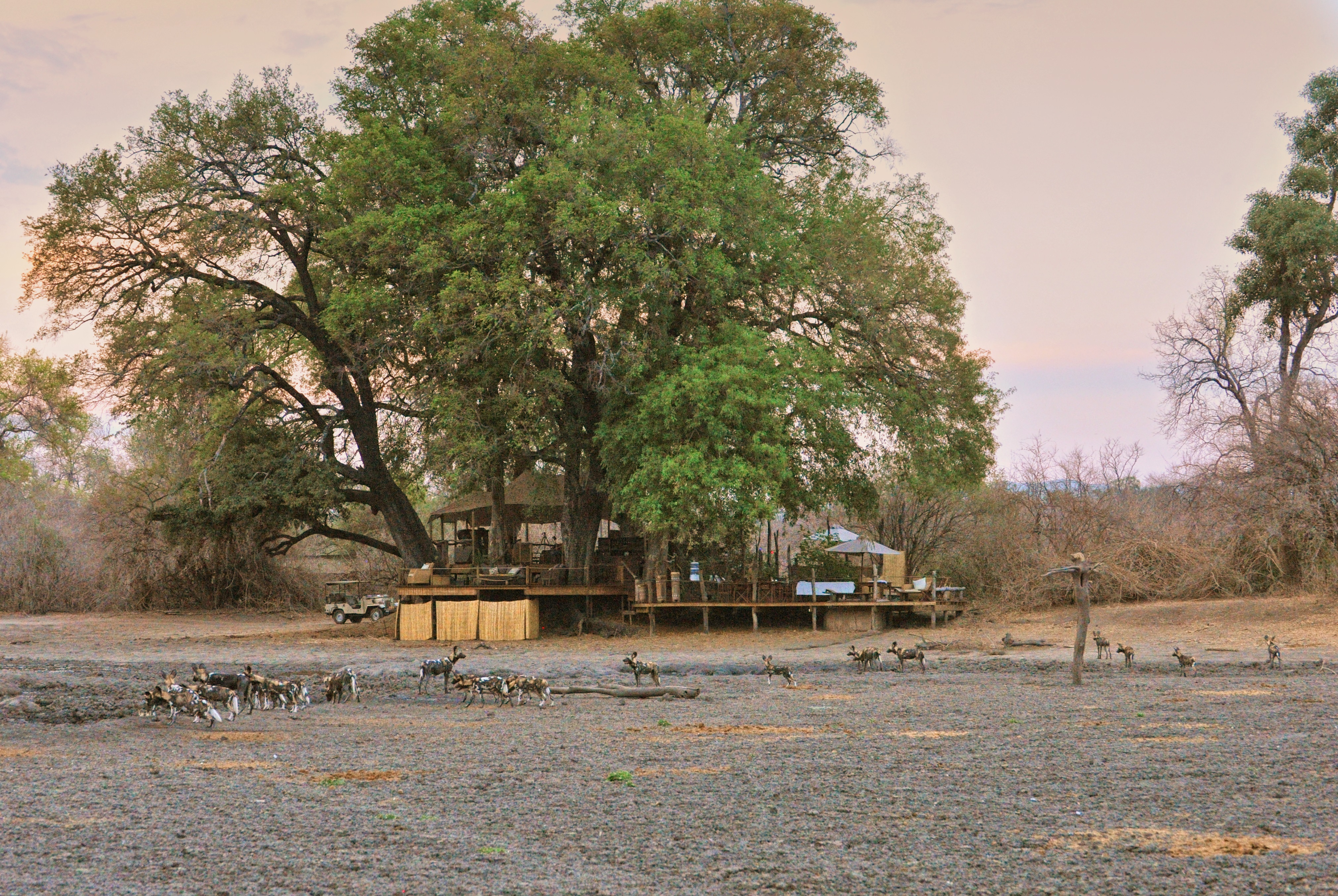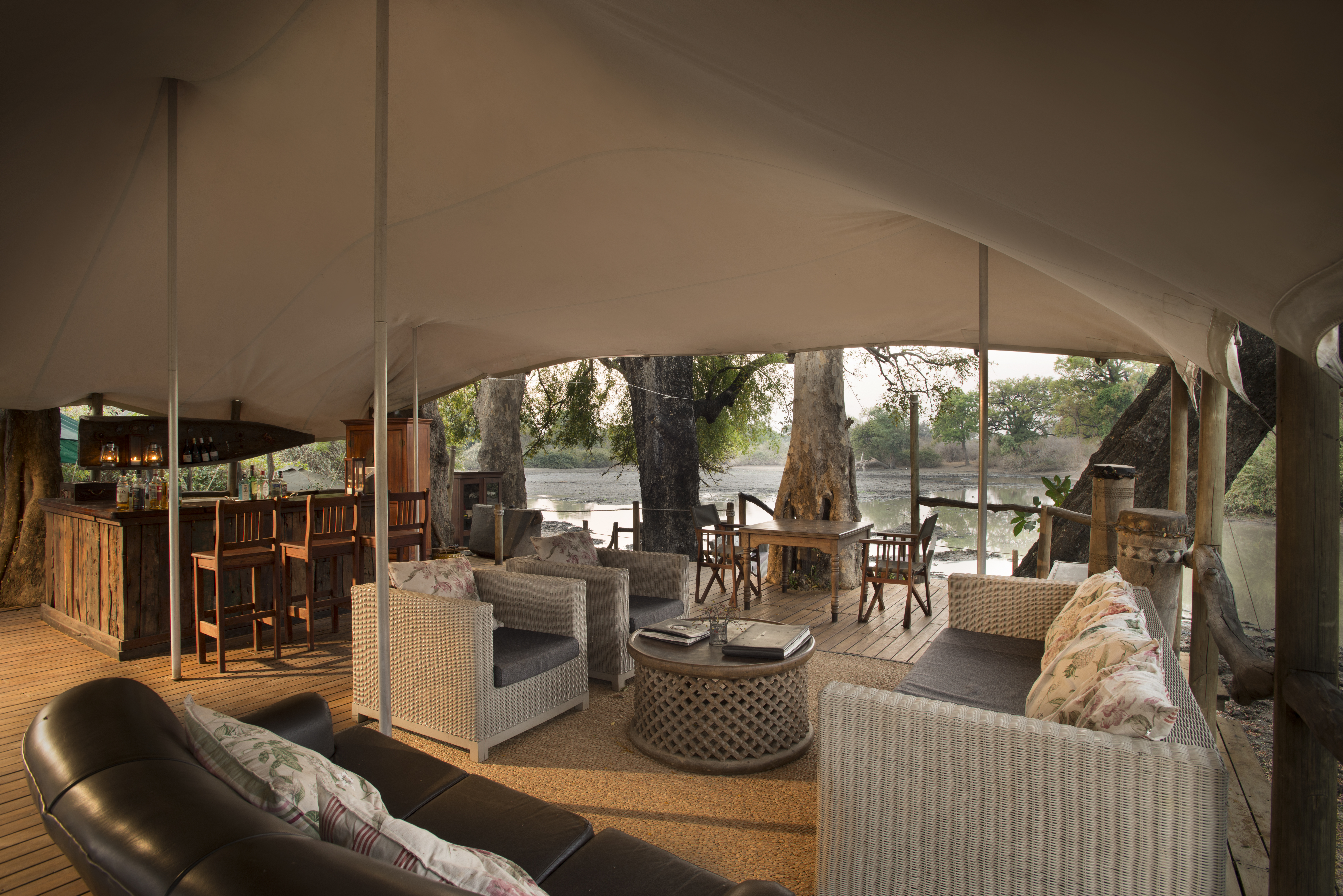 The main area is tucked beneath some enormous old mahogany trees, beneath stretched canvas, overlooking a perennial waterhole. An open-air bar and plenty of cushiony lounging space with quiet little nooks, provide ample real estate for between-activity chilling. A small plunge pool peers over the waterhole, adjacent to another large deck where most meals are served. Down a series of steps you'll find the fire pit where evening beverages and starry views are enjoyed, and the day's exploits are recounted.