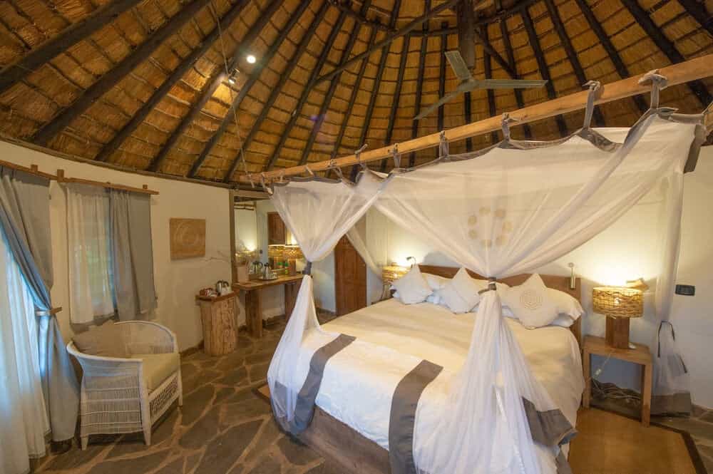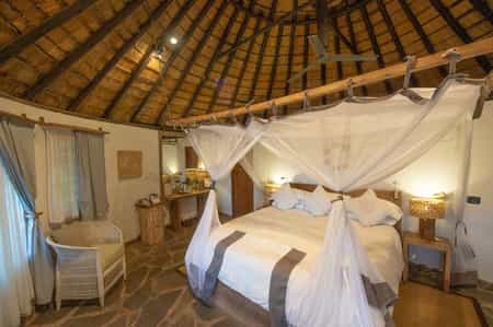 There are six thatched stone rondavels (round huts), each with its own wooden veranda facing the river. Inside, stone floors help to keep things comfortably cool, double beds are draped with mosquito nets, walk-in wardrobes offer plenty of storage, and the en-suite bathroom has a shower, basin and toilet. The double-storey family unit has three separate suites and a shared deck. The decor throughout is generally quite rustic and simple, but it works well to create a lovely homely feel.