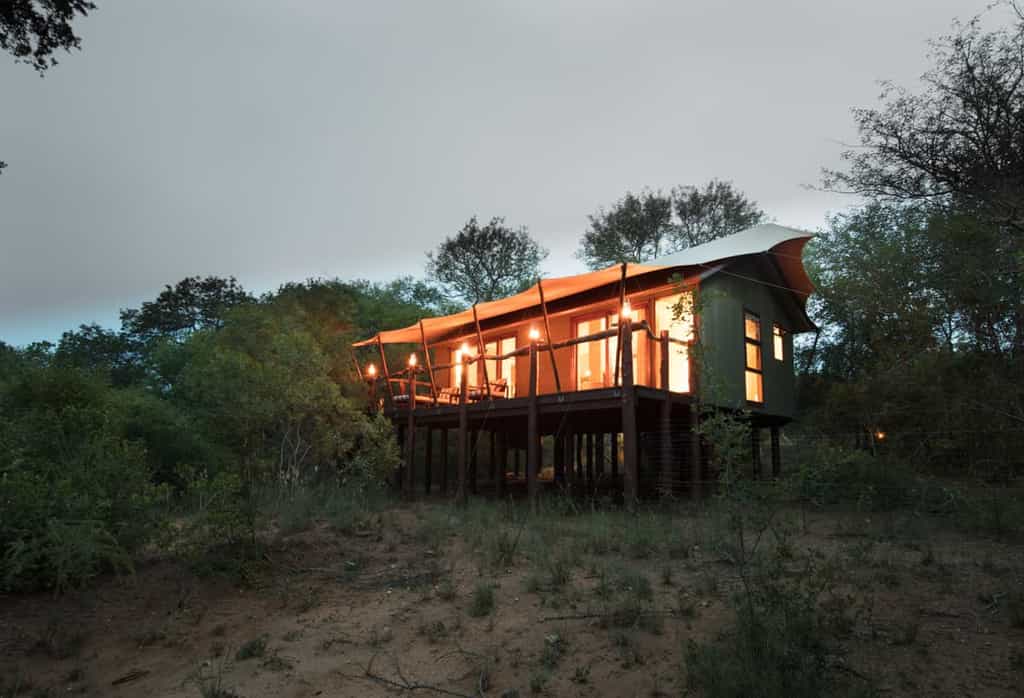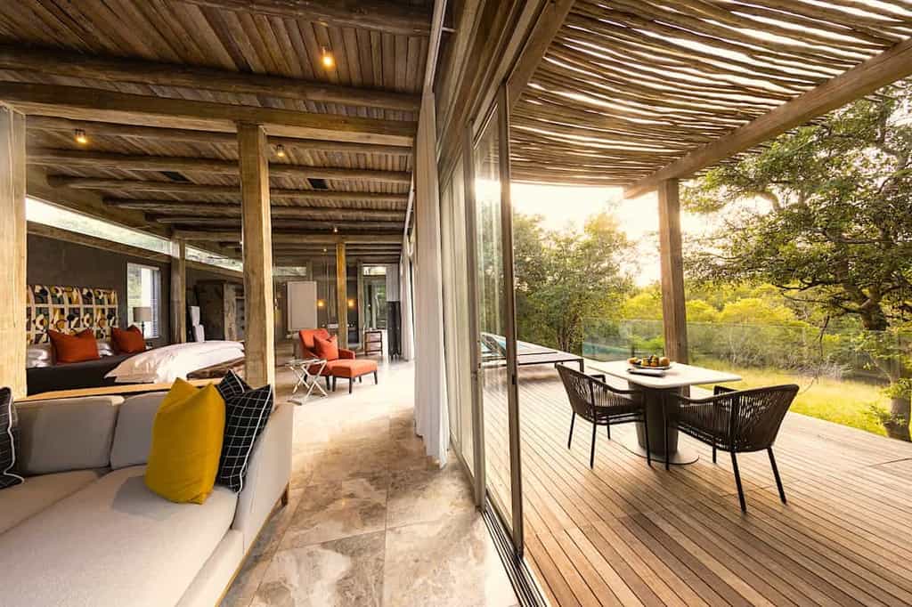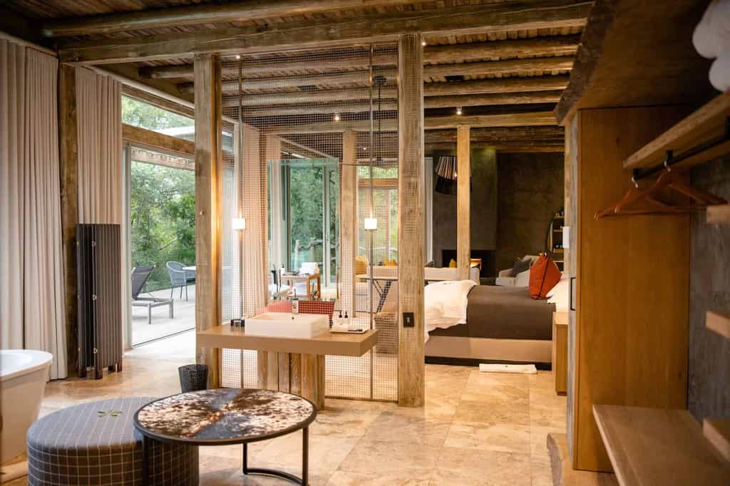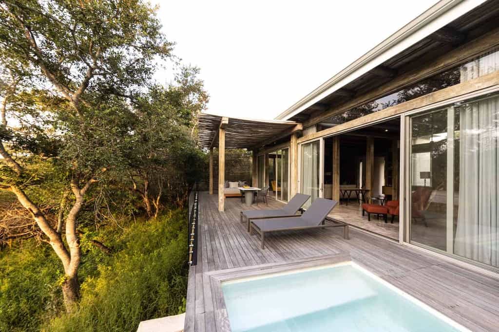 The thatch and stone guest lounge and bar is beautifully positioned on a raised timber deck overlooking the river, with high ceilings to catch the breeze, and a huge open fireplace for winter warmth. The interior has a contemporary feel, with warm earthy colours blending in naturally with the surrounding bush, and an open-plan design flowing onto the outdoor dining terrace and swimming pool deck. Dinners are usually served under the expansive night sky in the traditional African boma.