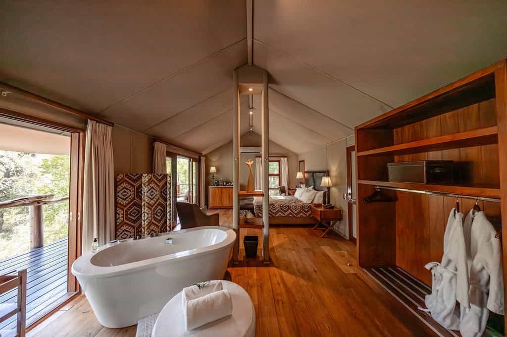 10 vast, tented double or twin suites overlook the river from stilted wooden decks, linked to the main lodge by raised timber walkways. Bathrooms are en-suite, with a shower and a deep standalone tub separated from the bedroom by folding screens. Décor is elegant and low-key: crisp, white linen, chic African throws, and dark wood and leather finishes hark back to a bygone safari era, with welcome modern luxuries like air-conditioning, heated blankets, coffee machines and mini bars.