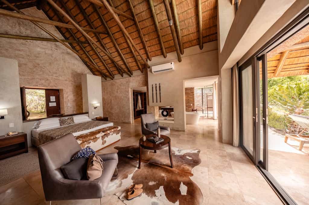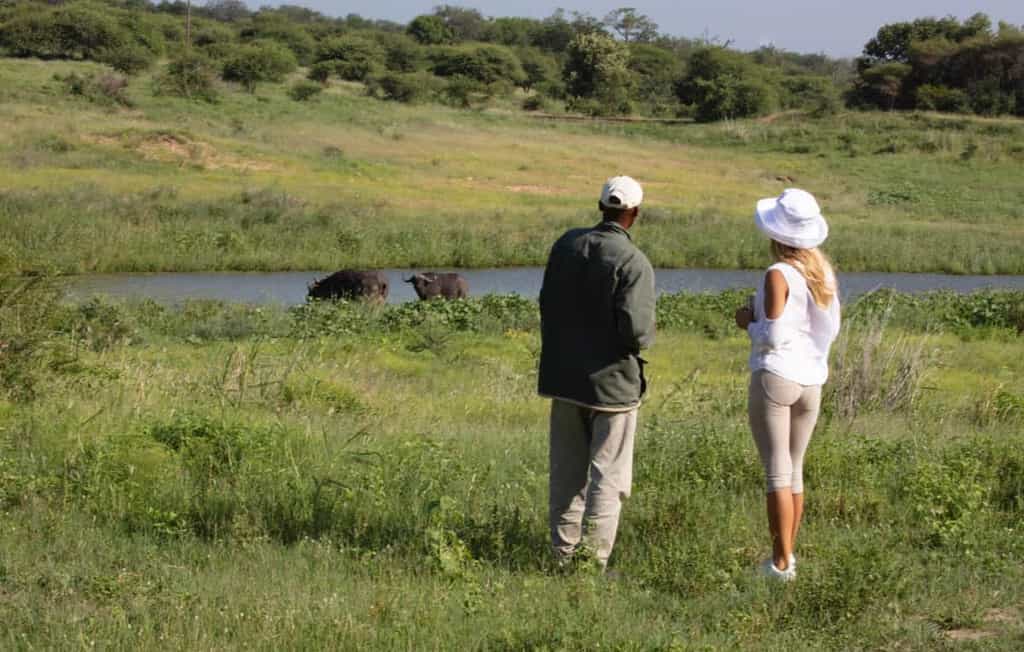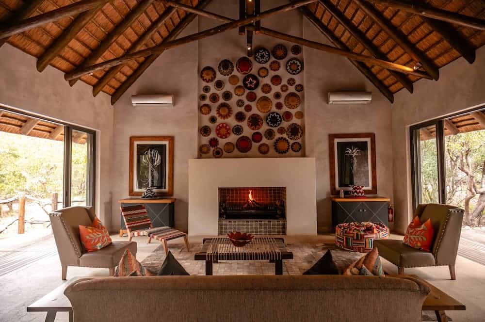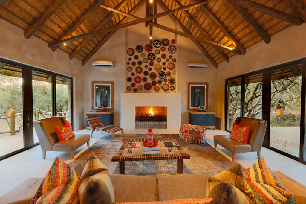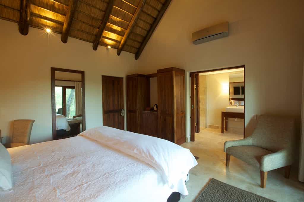 Breakfast and lunch are served in the thatched, open-sided dining room overlooking the bush. Beside it, the lounge area has comfy couches that are perfect for settling back and taking in the scenery. There's a good wine cellar stocked with bottles from some of South Africa's top estates. If the weather's favourable, dinner may be prepared on an open fire, safari style, and enjoyed in the traditional outdoor boma, with the flames and the stars as lighting.
