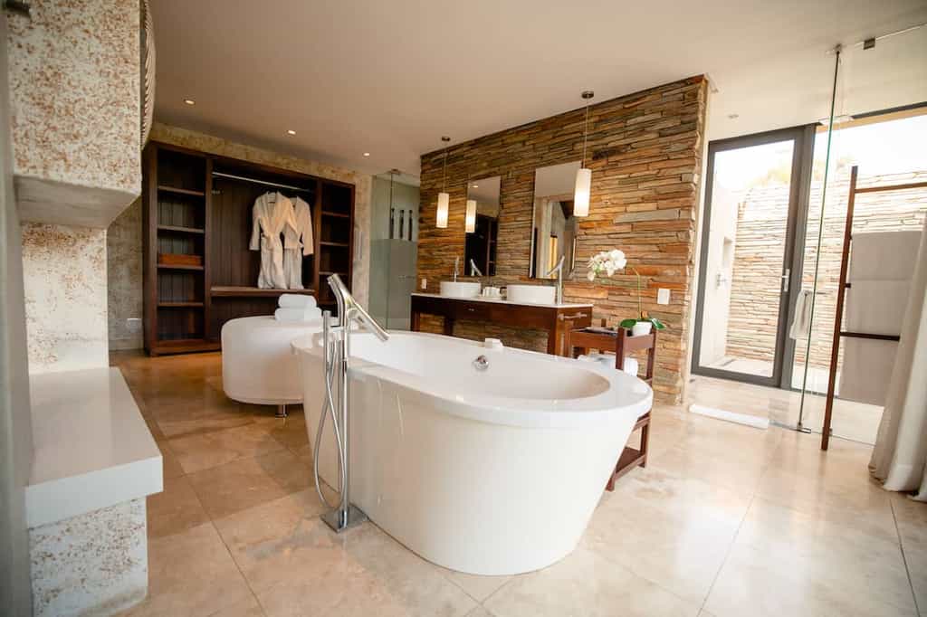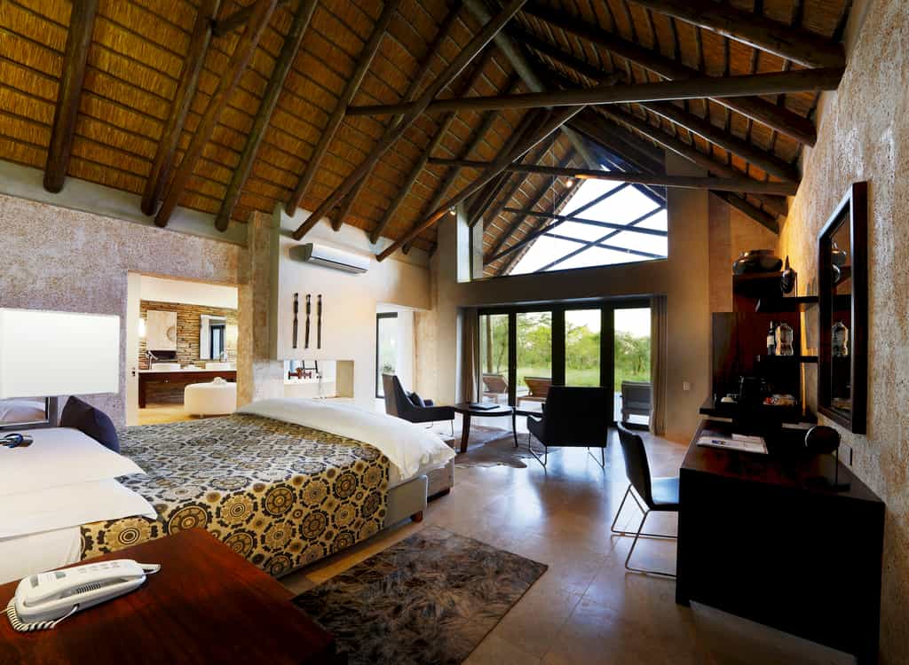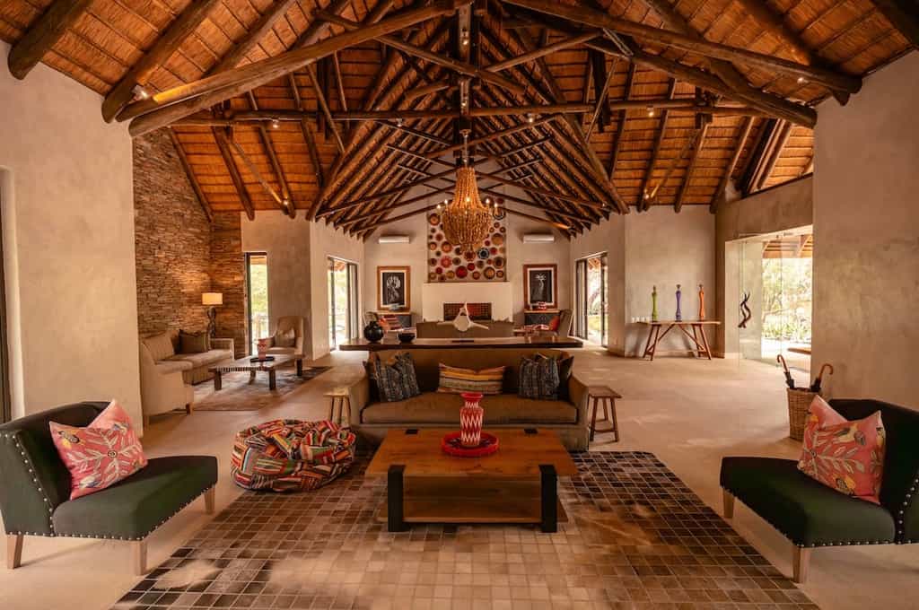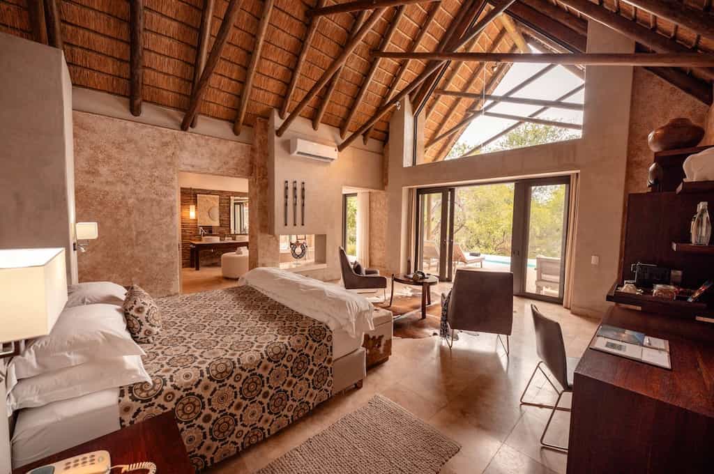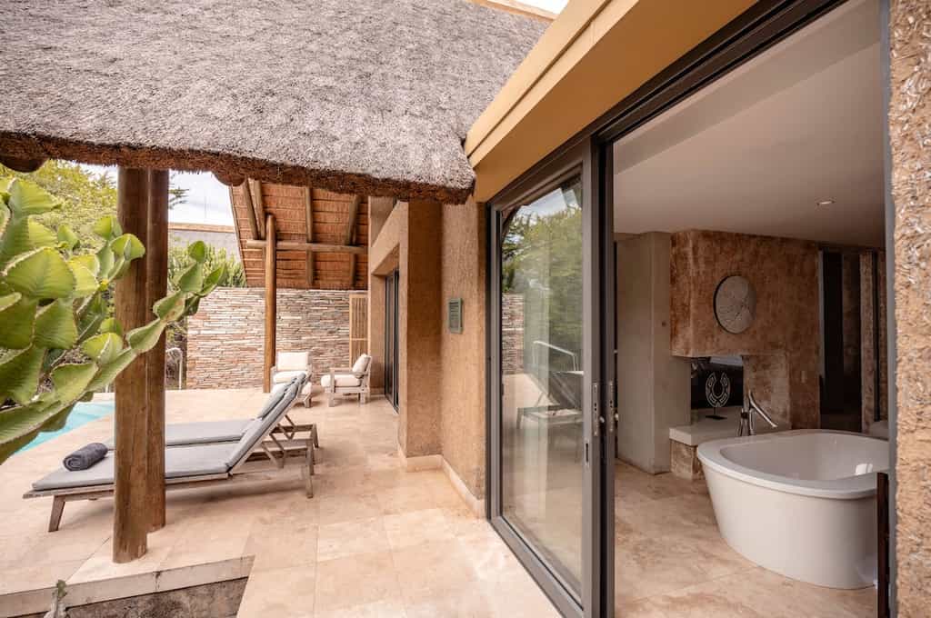 Breakfast and lunch are served in the thatched, open-sided dining room overlooking the bush. Beside it, the lounge area has comfy couches that are perfect for settling back and taking in the scenery. There's a good wine cellar stocked with bottles from some of South Africa's top estates. If the weather's favourable, dinner may be prepared on an open fire, safari style, and enjoyed in the traditional outdoor boma, with the flames and the stars as lighting.