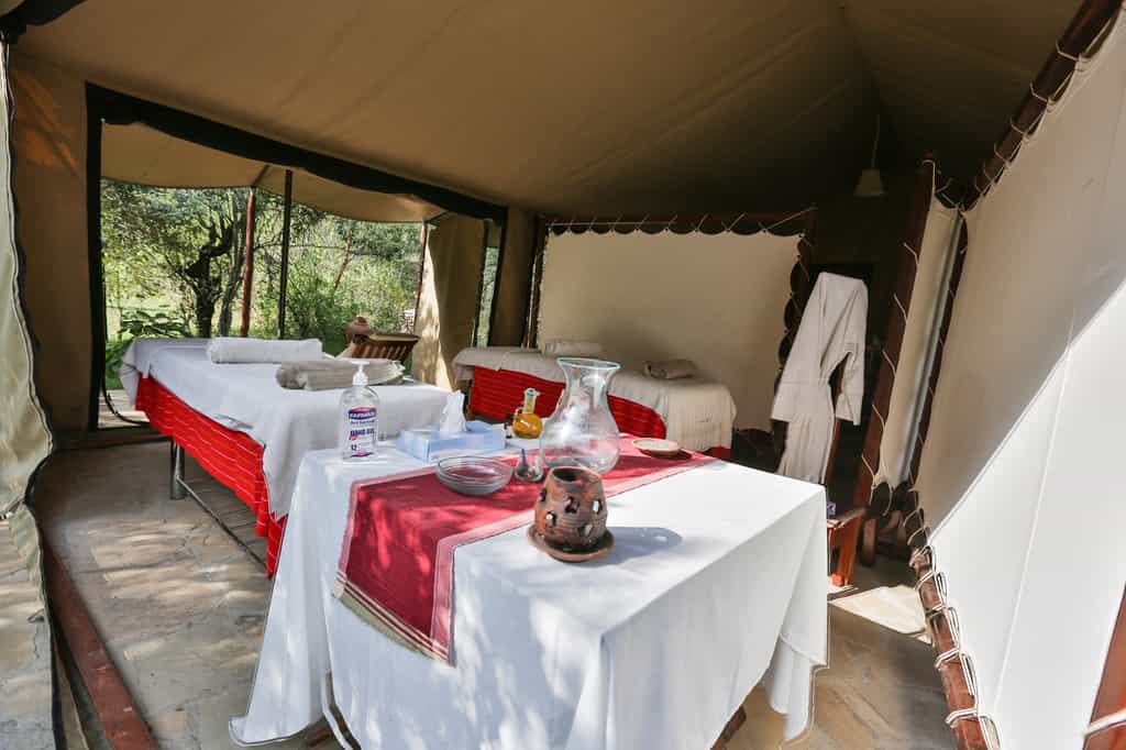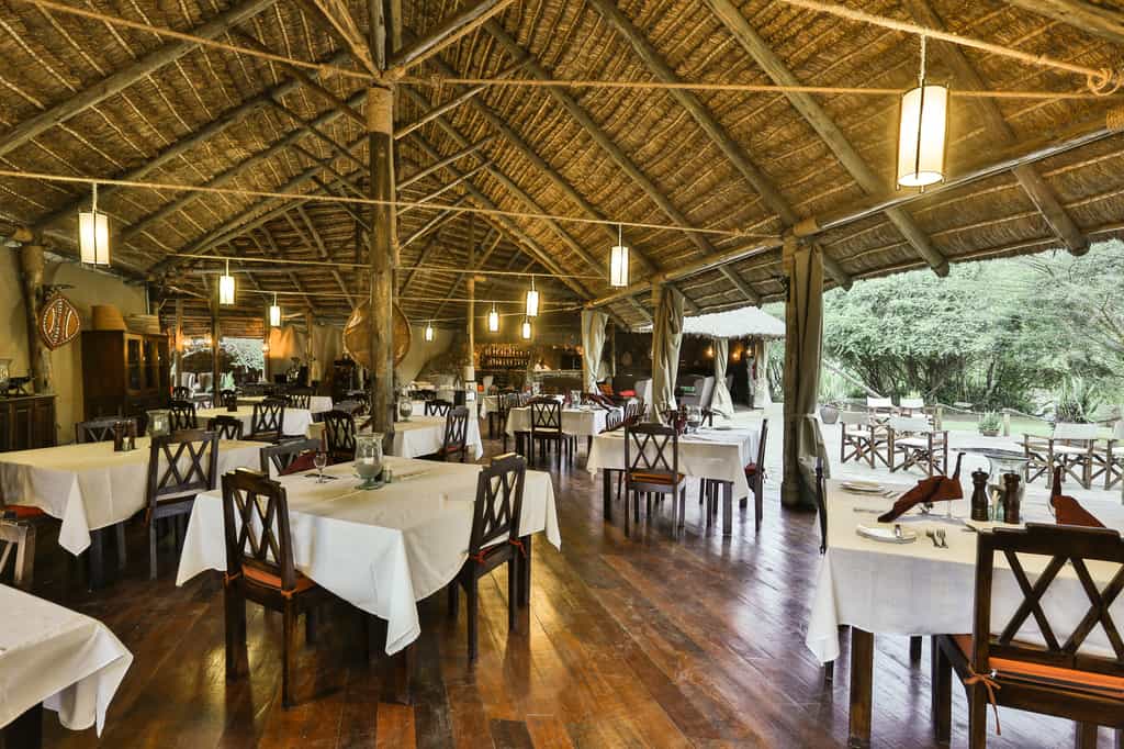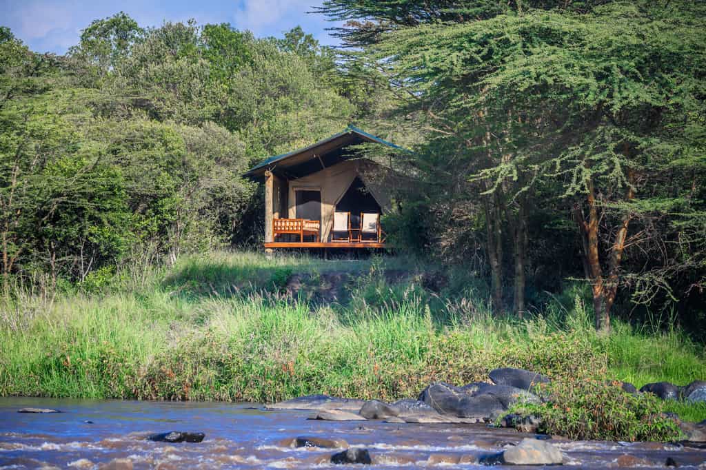 22 spacious platform-mounted tents lie along the riverbank, each fronted by a veranda with wonderful views. Two tents share a platform, a perfect family option. Traditional safari style – heavy canvas, roll-up windows, solid wooden floors and vintage furnishings – echoes the 'Out of Africa' atmosphere of a century ago. The mood continues in elegant armchairs, beautiful linens and solar lights disguised as hurricane lamps. Bathrooms are en suite, with a screened outdoor shower and bathtub under the sky.