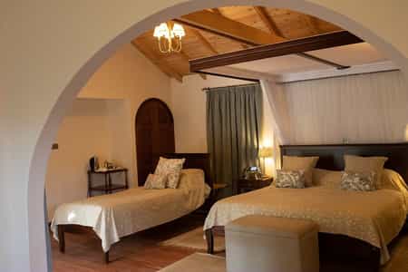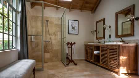 Set along pathways winding through the garden, there are 16 rooms, a trio of two-bedroom cottages and a honeymoon suite. The design captures the estate's history with wide archways, high, beamed ceilings and a fireplace (or two) to light on chilly evenings. Four-poster beds are topped with cream and beige linens, and draped in netting, while artwork showcasing the flora and fauna of Kenya lines the walls. The bathrooms are spacious, with double basins and rainfall showers. All cottages enjoy a private veranda but the family options have a much larger lounge area.