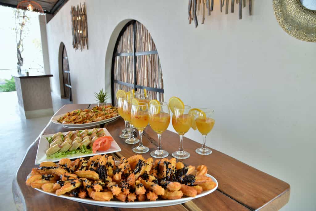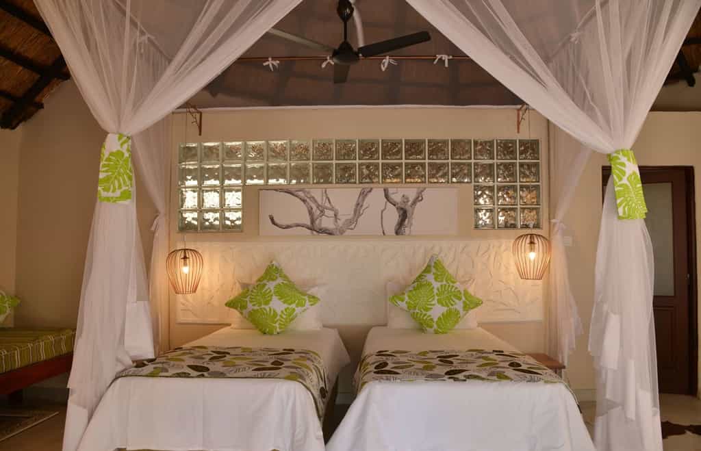 A collection of lodges and suites is dotted across the hillside, sloping towards the lake-side 'beach.' The rooms are decorated in a warm, earthy style with leaf motifs and local art, and a King-sized, net-draped bed enjoys a private nook and views of the lake through large windows. There are nine open-fronted lodges and eight suites (that sleep two extra on Indian day beds), and all have a private patio. The bathrooms are rugged with wooden towel rails, stone walls and well-appointed amenities.