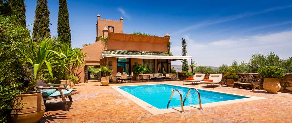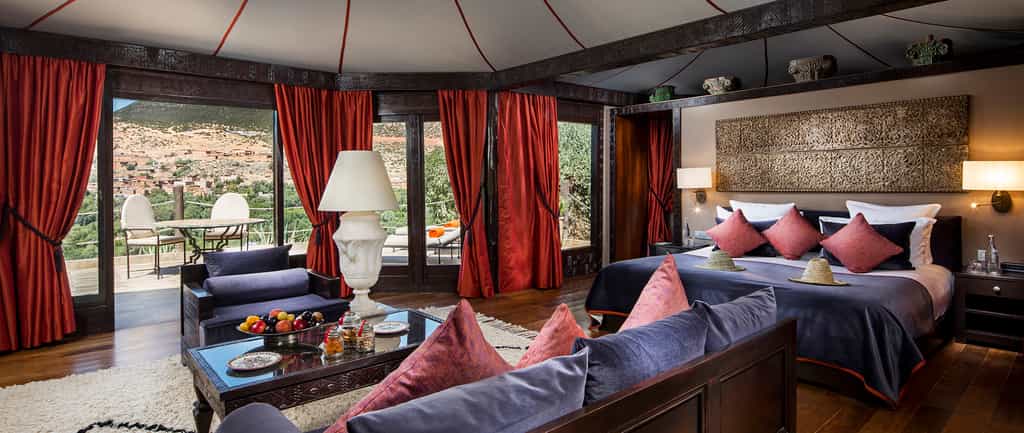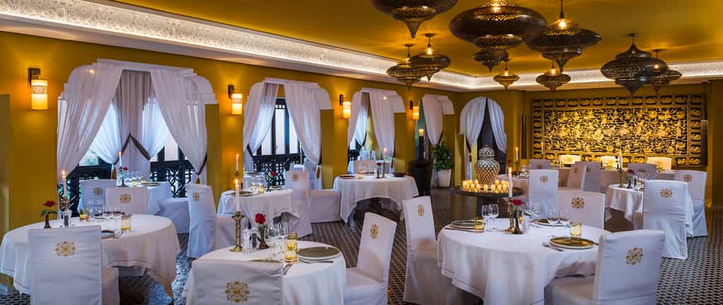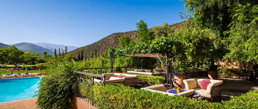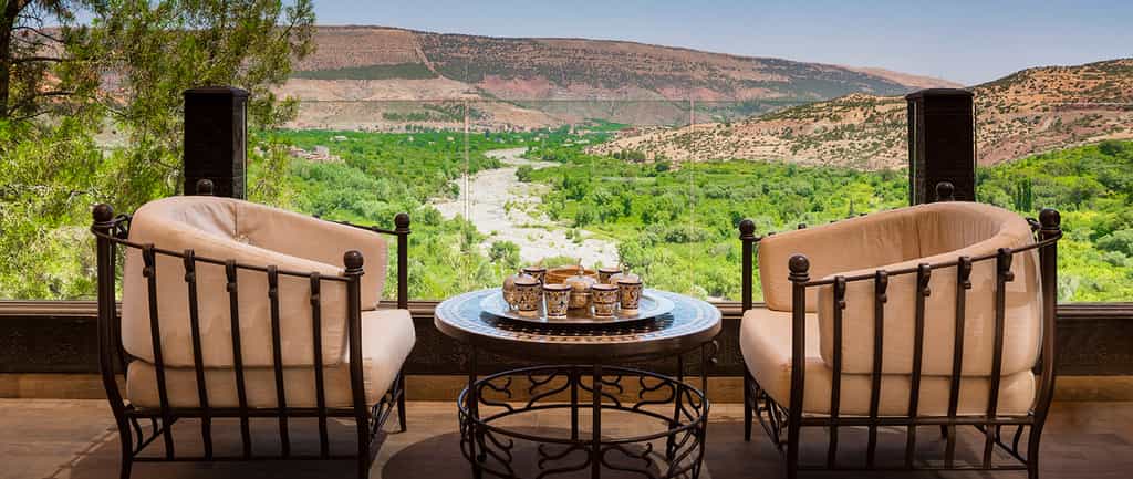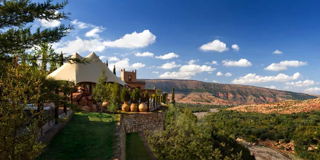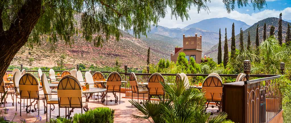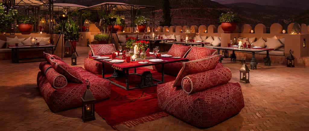 A terracotta-coloured fort in the mountains, the Kasbah Tamadot knows how to appreciate a view. Enjoy it from the infinity pool, pouf-strewn courtyards, or the romantic rooftop terrace. The kasbah gets its spices from Marrakesh, seafood from the Atlantic coast and vegetables from Asni, and all prepared into a superb menu of local and international dishes, for consumption in the dining room, round the petal-laden pool, or on the terrace. At the end of the day, grab a cocktail in the silky lounge and enjoy the melodies of local musicians in the amphitheatre.