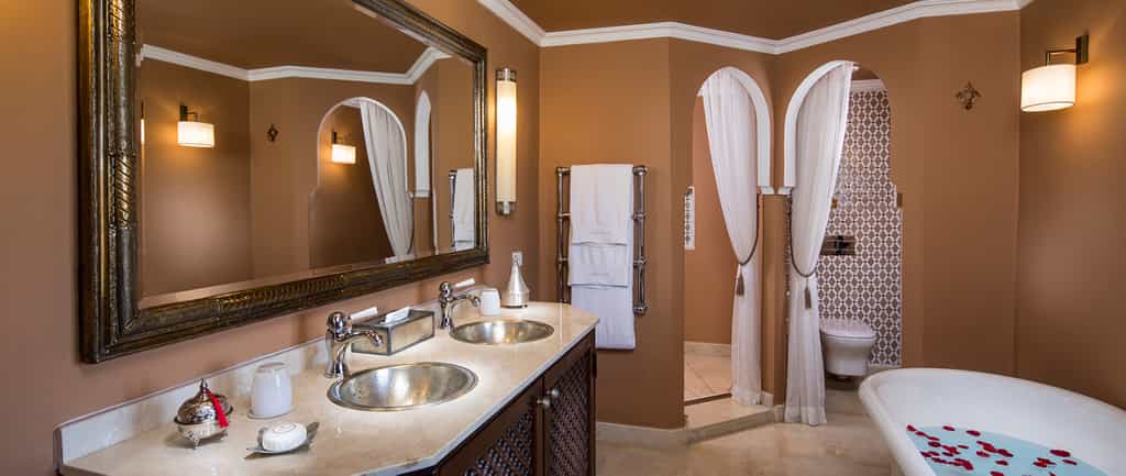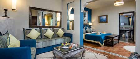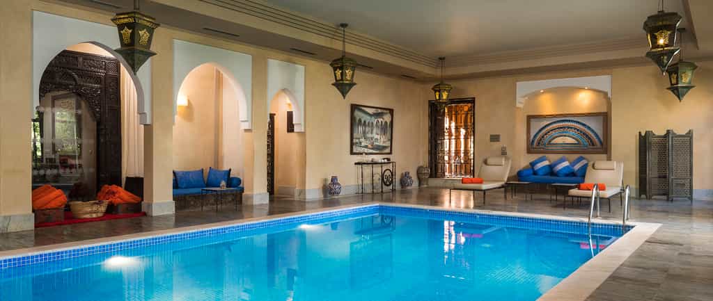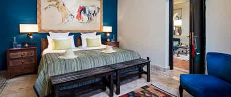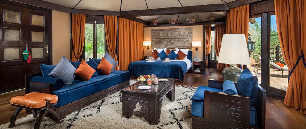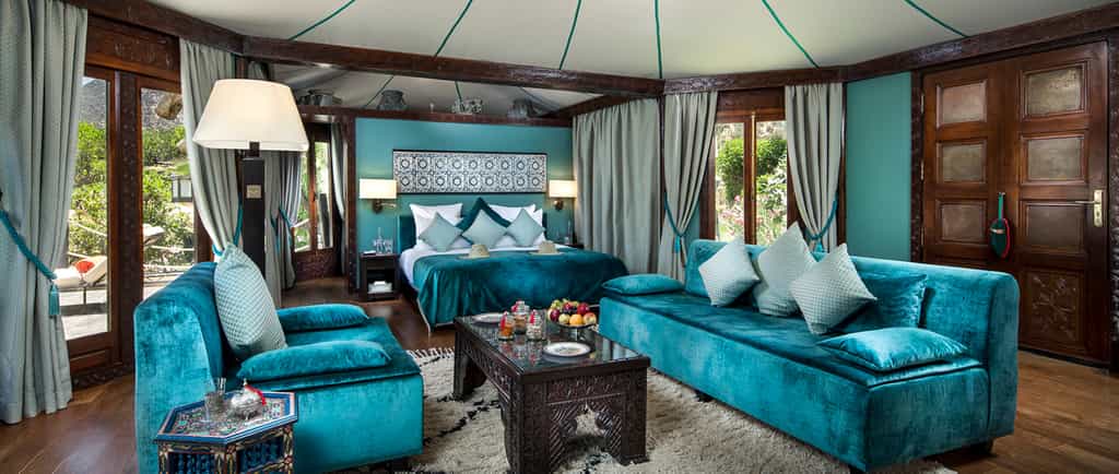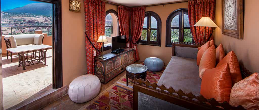 To put it plainly, the rooms are gorgeous. Ornate antiques and glossy silks, velvet couches, and generous paintings under mosaic ceilings fill the rooms with colour. Handmade for the hotel, the King-sized beds are cushy and wonderful, and most rooms have a lounge area and terrace. The suites are stunning with grand arches, plush furnishings and a fireplace. Further down the garden, the Master Suite is a mini kasbah with three bedrooms, huge Moroccan bathtubs, a private pool and rooftop terrace. Kasbah Tamadot also has six luxury riads.