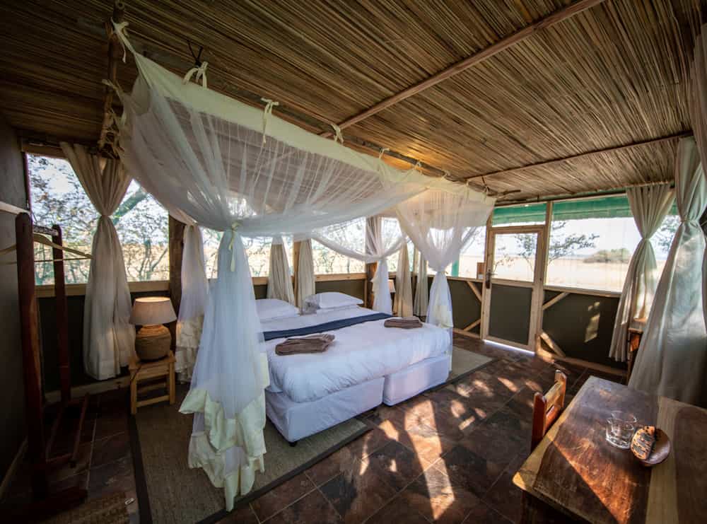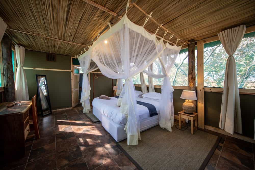 Stationed on the edge of a teak forest overlooking a seasonal floodplain, Kasonso feels utterly wild. With few bells and whistles to distract from the surrounds, it nevertheless makes a statement about the purity of a bush experience like this. At its heart sits a canvas mess tent, with a small cushioned lounge and a dinner table. Just in front is the campfire area, where nightly drinks are shared, stories recounted and stars serve as the decorations.