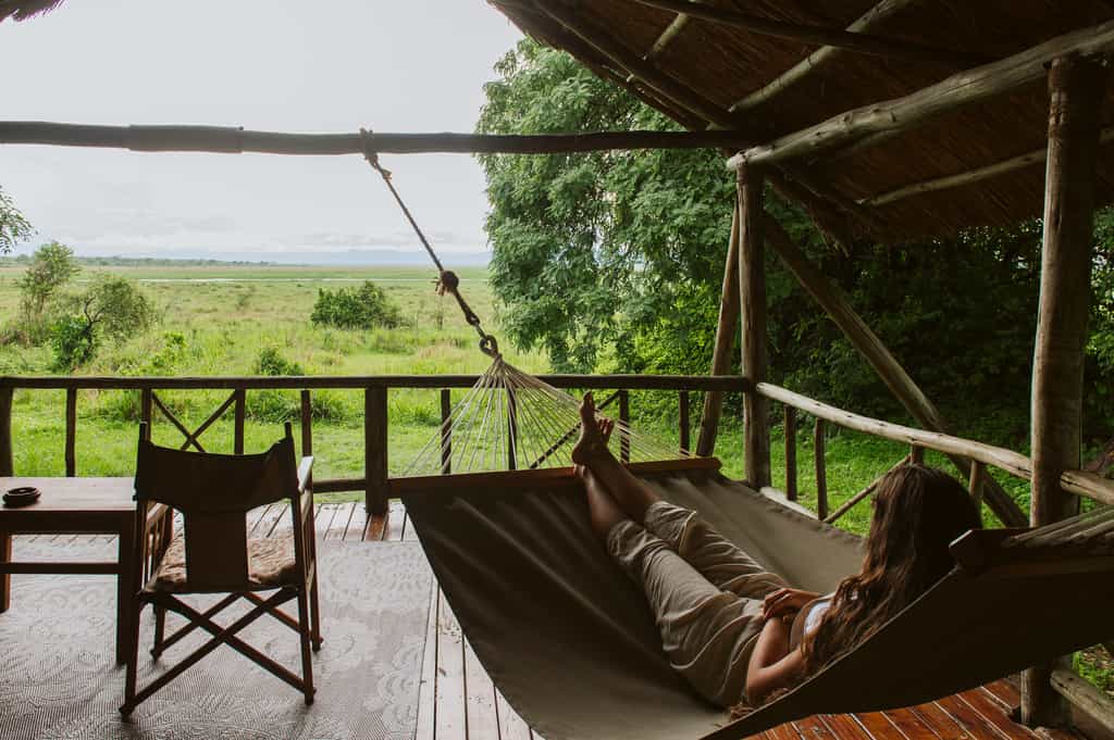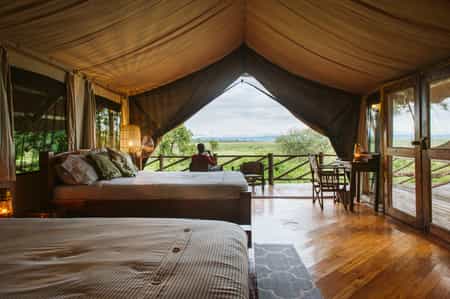 Katavi Camp has eight spacious Meru-style tents built on raised wooden decks, under thatched roofs, three of which have plunge pools. Each has a large shaded veranda with two wooden armchairs and a hammock to make the most of the breeze. Inside, the mesh windows on the front and sides create a light, airy feel, especially welcome during the warmer months. There's a writing desk, a luggage rack, a rustic but comfortable bed and an en-suite bathroom with a solar-heated shower. Two family units are available.
