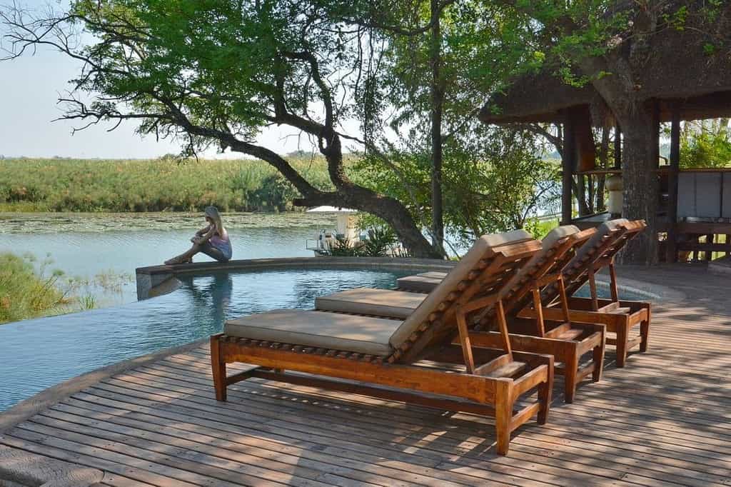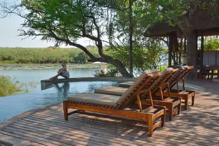 Facing the river, the thatched main area has been built on a sturdy timber deck that curves around a pair of ancient baobab trees. The bar/lounge area has open sides overlooking the swimming pool, which drops down to a narrow strip of grassy riverbank and the jetty. Most meals are served on the outside pool terrace, with superb views of the Zambezi River. Check your day's sightings in the well-stocked reference library and visit the curio shop for memories.