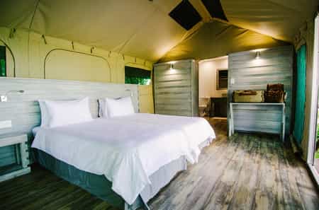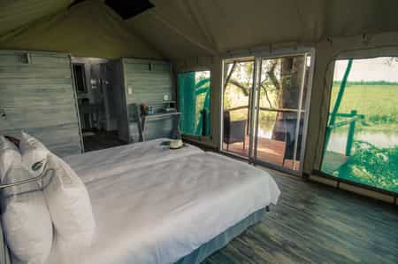 Ten Meru-style tents are perched on wooden platforms among the trees, overhanging the tranquil water's edge. Each has an en-suite bathroom and private viewing deck. The clean, minimalistic decor and simple single beds pushed together (or apart) let nature do the talking. Enjoy breathtaking views from the comfort of the viewing deck before retreating to your en-suite bathroom for a refreshing shower. Each room has a fan and a small safe for your laptop and other belongings