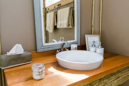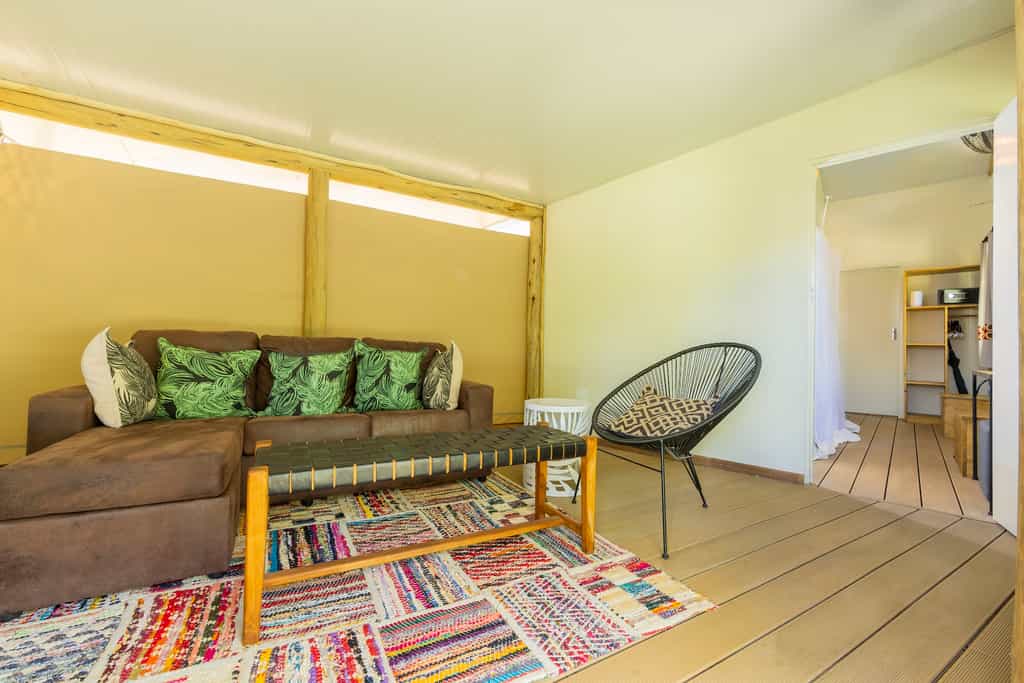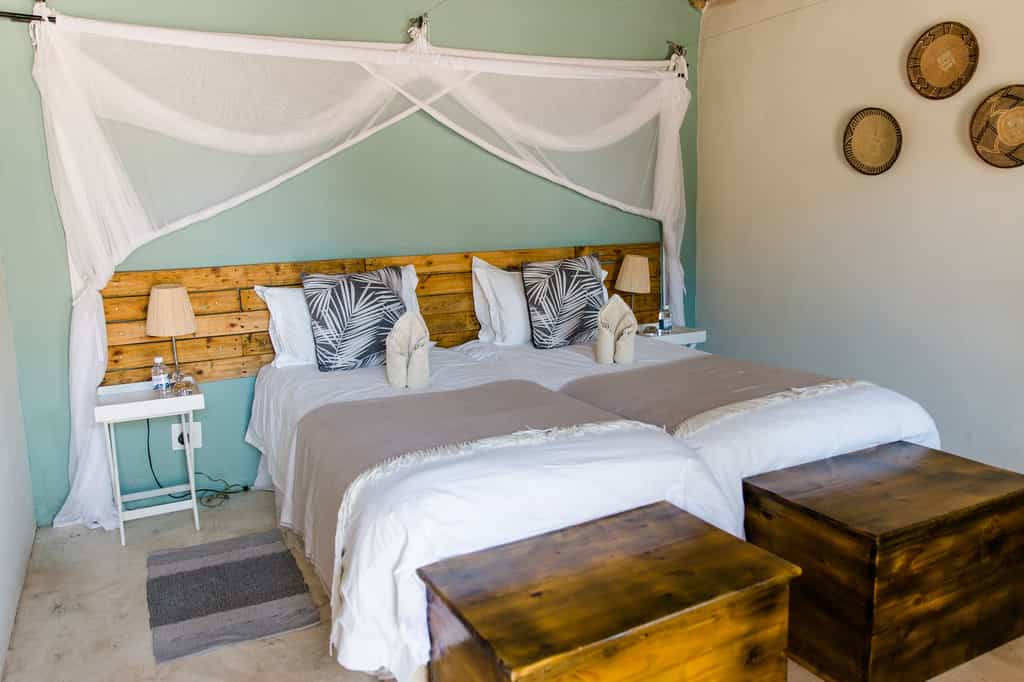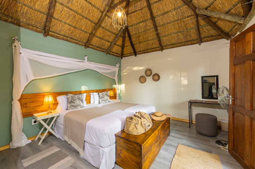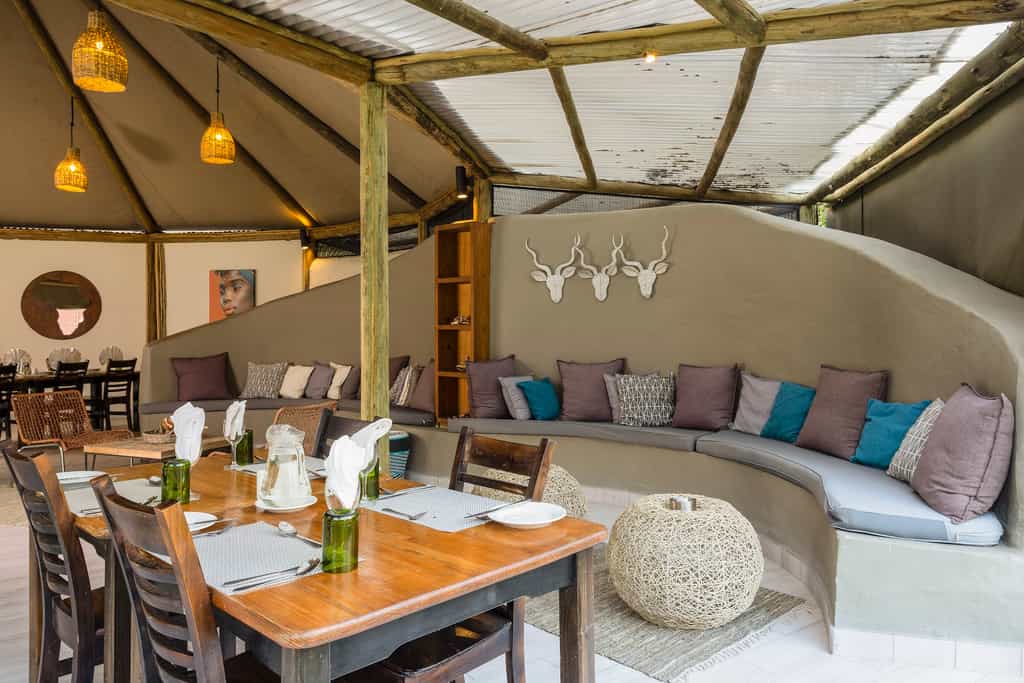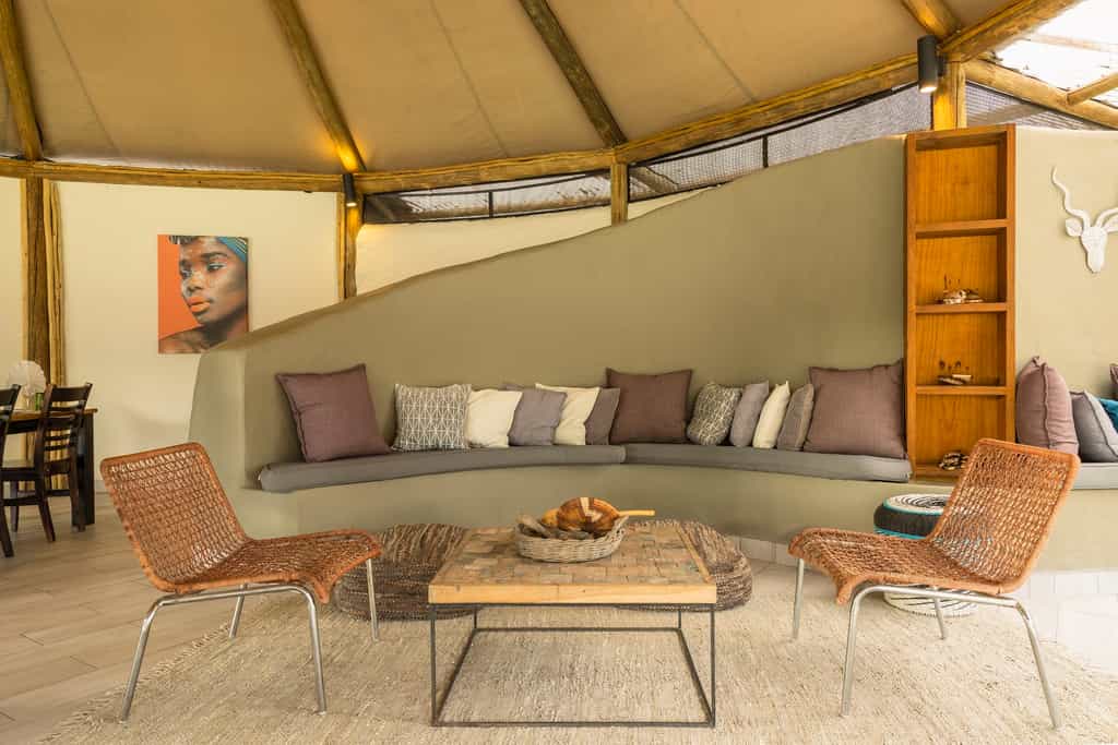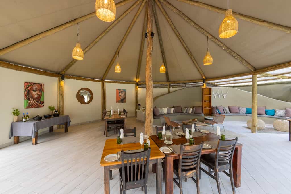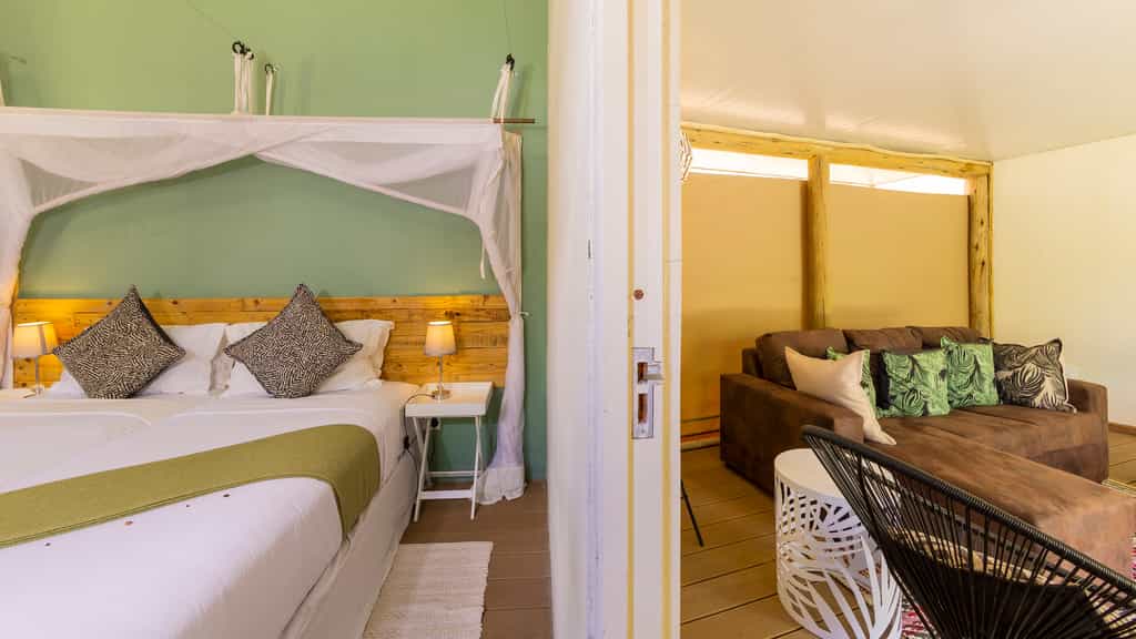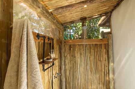 The six cleverly built, low impact structures sleep two each in either double or twin bed configurations. They are positioned relatively close to one another, however, connected to the main area via sandy pathways. Each room has an ensuite bathroom and private open-air shower and are stylishly decorated with one brightly colored wall and a few funky patterned cushions. Each has closet space, a fold-away mosquito net, a safe to secure valuables and a ceiling fan. You'll have all you need and nothing you don't.