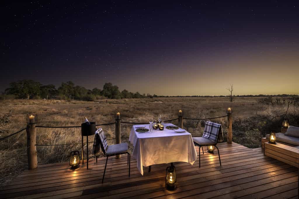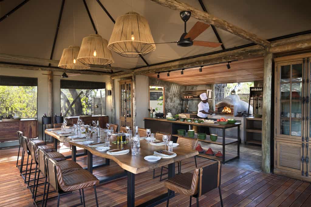 Khwai Lediba's central area is a raised marquee overlooking a quiet lagoon, the perfect place to sit and unwind. The open-plan communal areas with comfortable, rustic furniture and hand-carved African accessories make one feel at home in the bush. The main area consists of a canvas-covered raised wooden decking, joining the bar, dining and lounge areas. This leads into the campfire area, where evening sundowners, hosted by your guide, are enjoyed as one reflects on the magnificent day.
