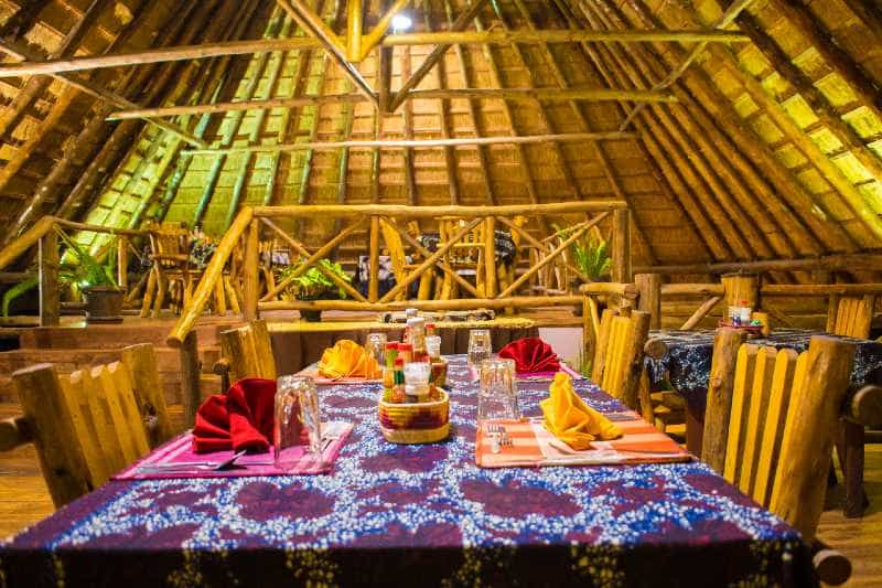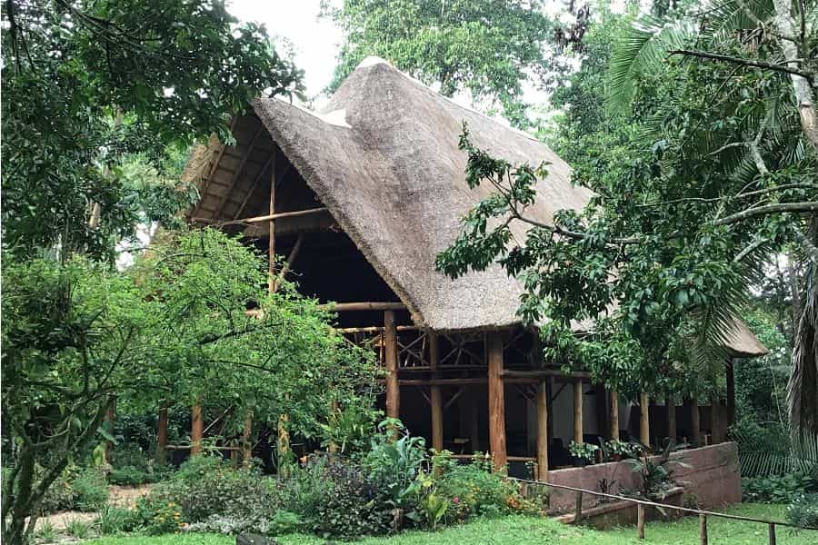 The wooden, grass-thatched main building houses the bar and restaurant, their sides open to the bright garden and the forest. Meals follow a set menu, as produce is hard to come by locally and is brought in from Kampala daily, but the food is very good (as is the coffee!). Special dietary requirements will be met if you specify them when booking.