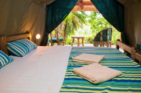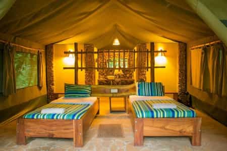 Accommodation is budget friendly, with a choice of seven tents with a communal ablution block, and 10 self-contained safari-style tents. The communal tents, all set beneath a grass-thatched roof, are perfectly adequate, with comfortable beds (bedding and towels provided) and a power outlet for charging your electrical equipment. The slightly more glam safari tents have hardwood floors, twin or double beds, en-suite bathrooms and, outside, a private veranda where you can relax and watch the colobus at play.