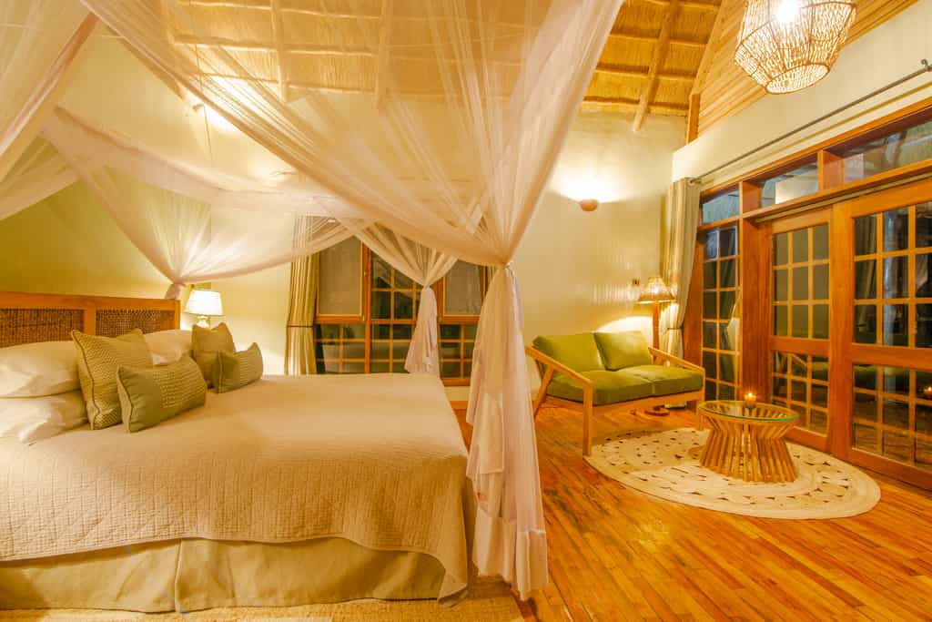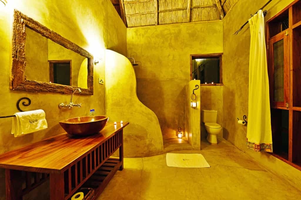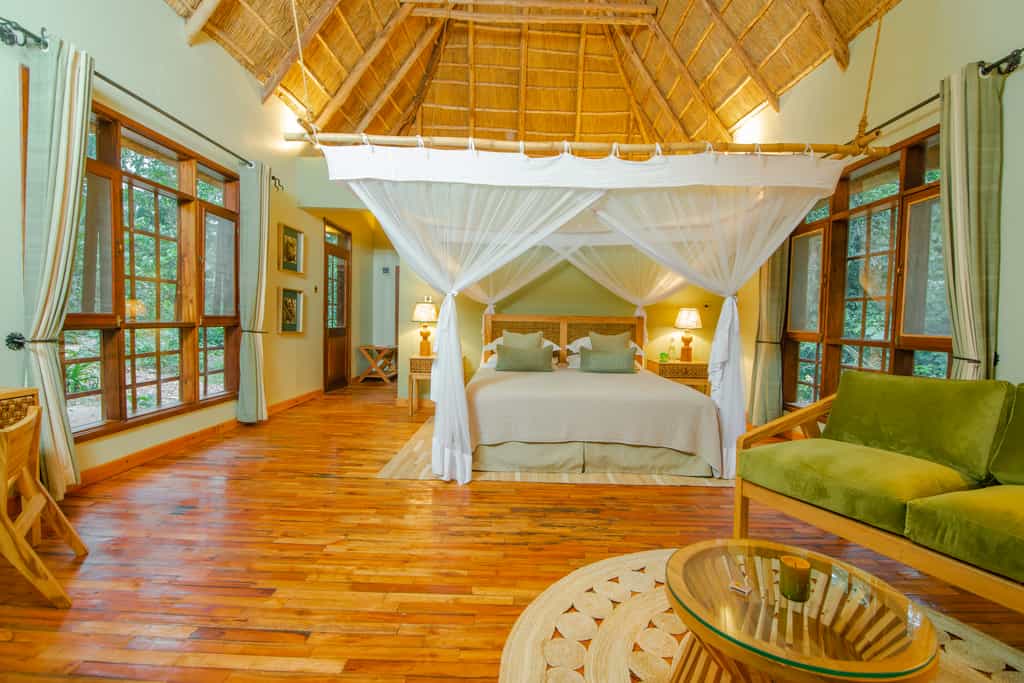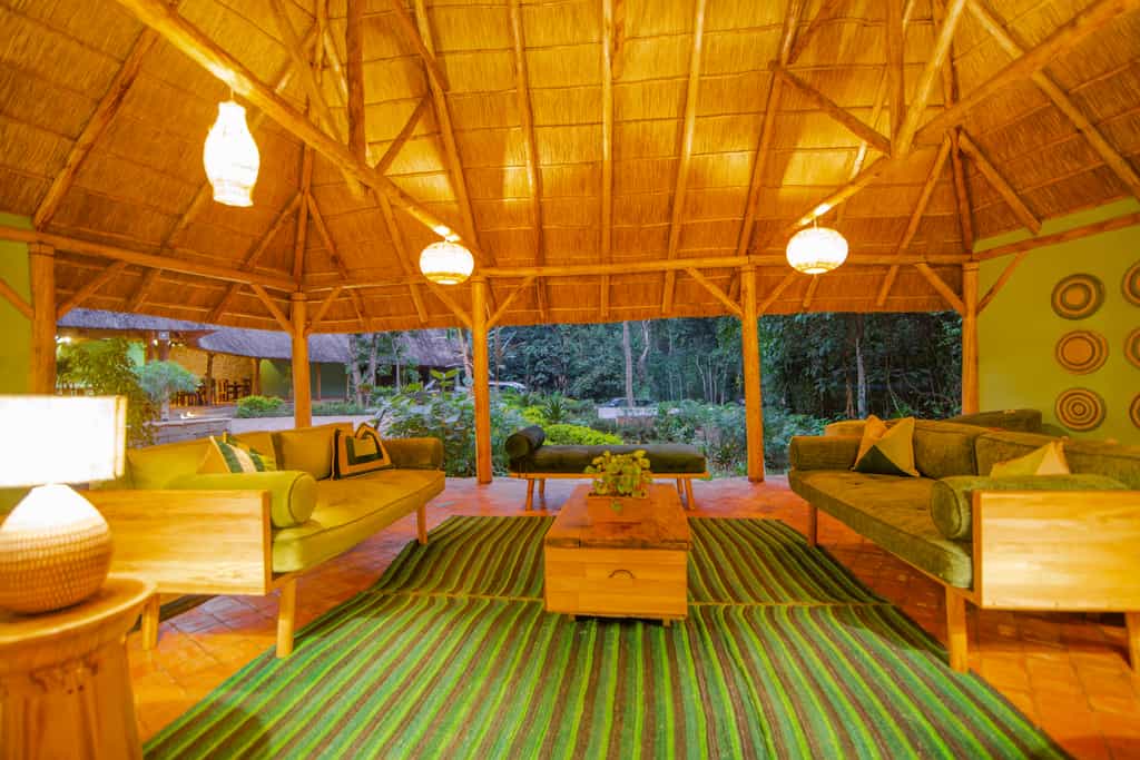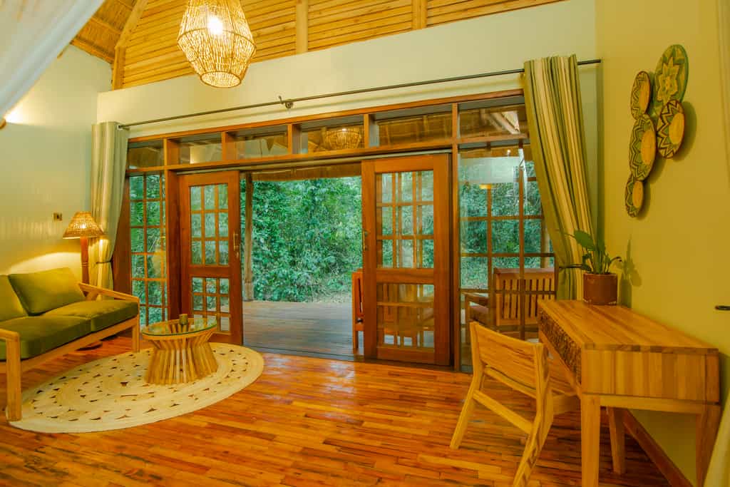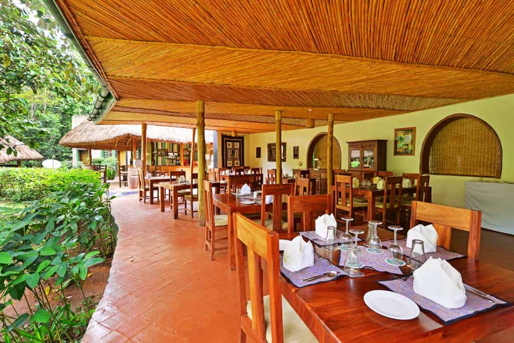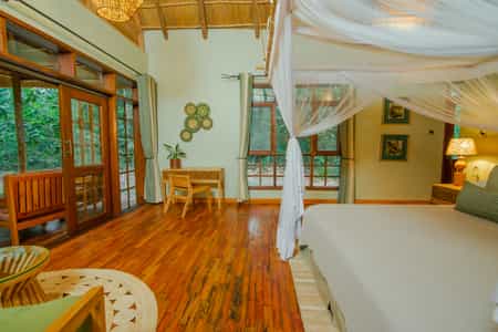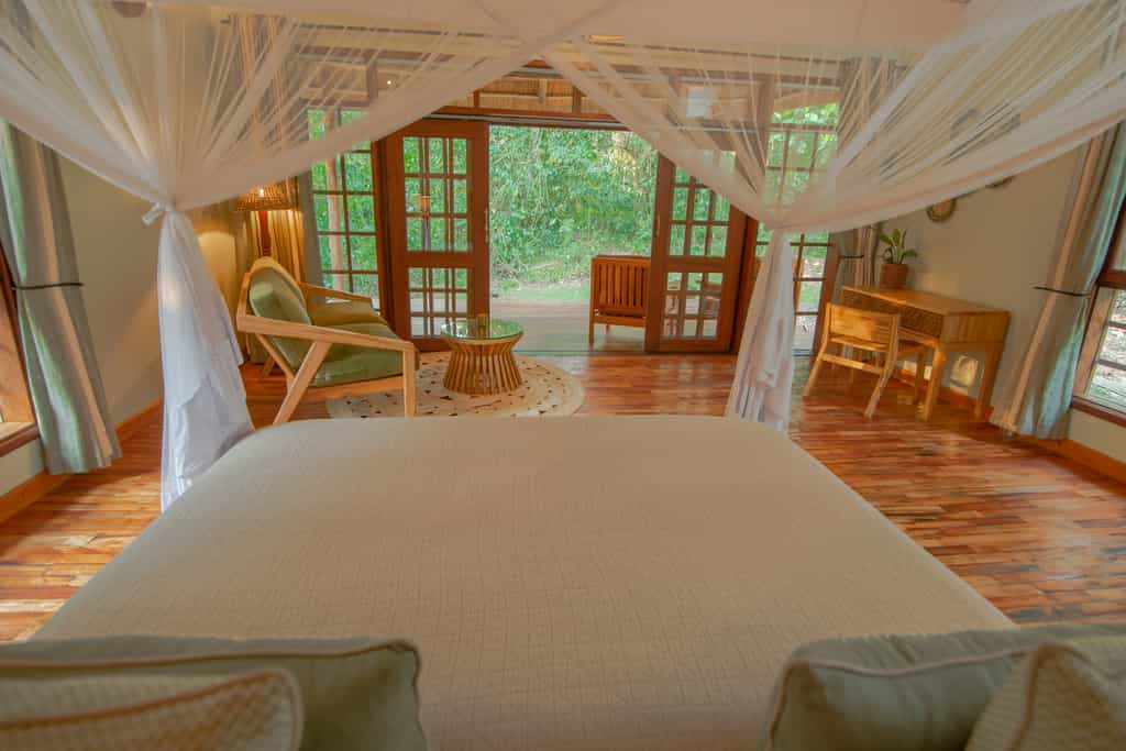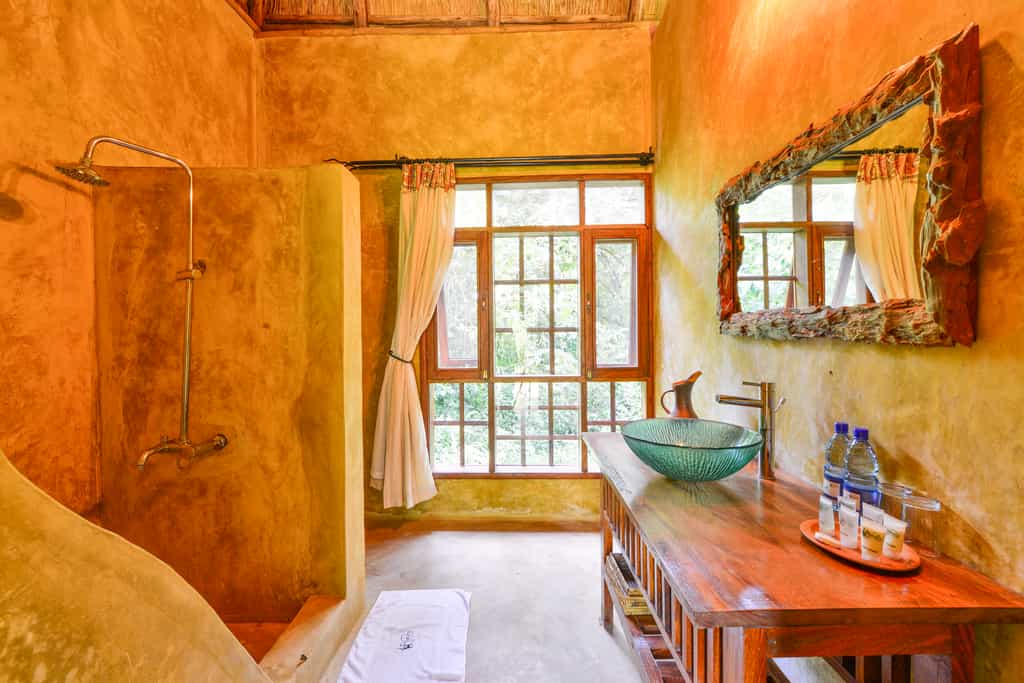 Three accommodation options are available: eight Safari tents, single-room Forest Cottages and the Sky Tree House. The raised, grass-thatched Safari Tents each have a queen-sized bed, bright linen, an en-suite bathroom of stone and bamboo and a private terrace. The Forest Cottages have twin beds, a sitting area, a full en-suite bathroom and a private veranda. The Sky Tree House has a simple bedroom, basic facilities at ground level, incredible views, monkeys all around and elephants at the nearby wallow.