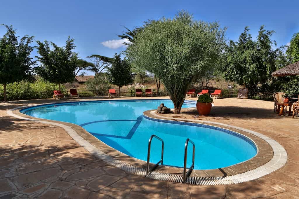 Shaded by spreading acacia trees and facing that famous peak, the open-air restaurant serves generous buffet spreads plus freshly fired pizzas from the wood-burning oven — fruit and vegetables are picked straight from the camp's own farm, which you can taste. The bar is a relaxed spot for a cold Tusker after a dusty game drive, and there's a decent-sized pool flanked by loungers for the inevitable afternoon lull. A small spa, art gallery and gift shop round things out, and the crackling bonfire is the social hub come evening.