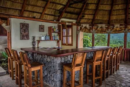 The beautiful thatched-roof and wood-framed main area sits perched atop a hill, with mesmerising tree-canopy views. The lovely open-sided dining and bar areas are where both meals and icy cocktails are served and downtime is spent between activities. There's a wood-burning fireplace that keeps things cosy when temperatures drop, as they do at night. Electric fencing surrounds the camp, so wildlife wandering in and out of camp is unlikely – however, listen out for woodland owls and other jungle sounds.