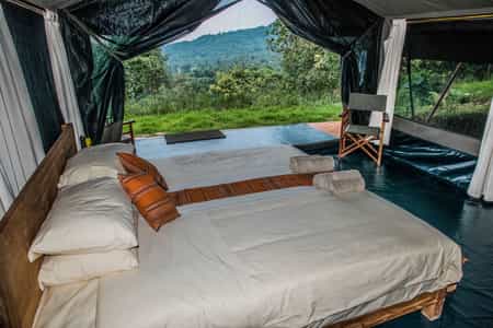 The 18 two-person tents are not only adequate but extremely comfortable, furnished with queen-sized beds and starched white linens, with hot-water bottles tucked neatly between the sheets for chilly evenings. En-suite bathrooms have flush toilets and hot showers. There are even two wall outlets for your camera or phone, overhead lights and plenty of bottled drinking water that is readily replenished.