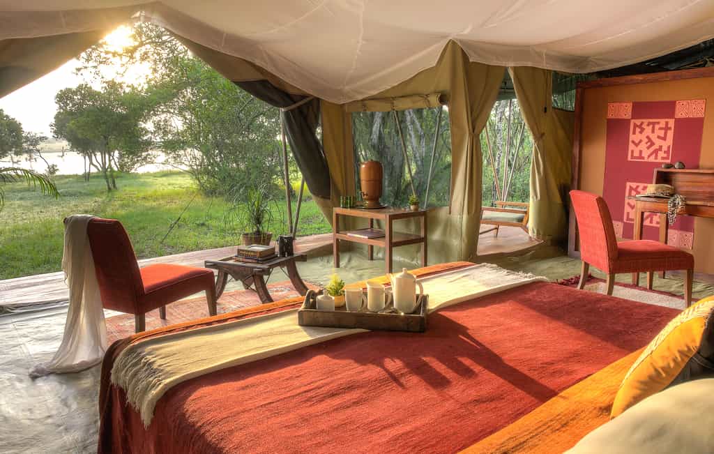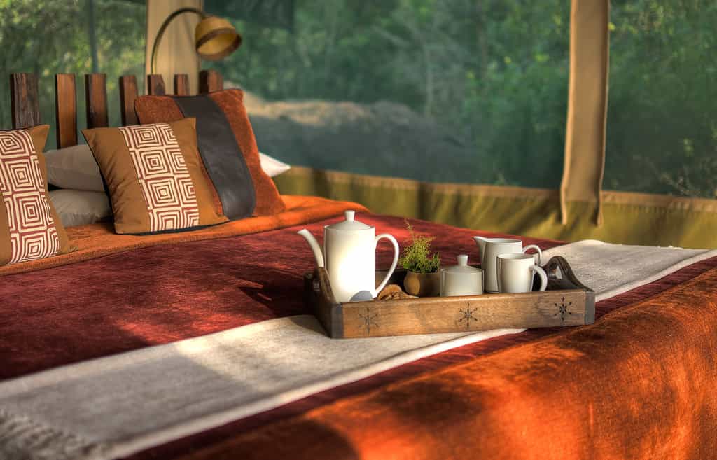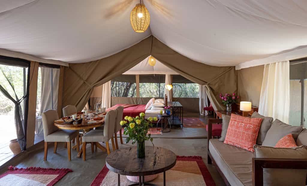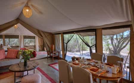 At the heart of the camp, a spacious tent in a shady grove is where meals are served and you can relax. Don't expect city-slicker style, the luxury here is the comfort – with plush sofas and chairs, rich-red rugs, two fireplaces that are lit on chilly evenings. Dine at the indoor communal table or outside in the shade, and have a siesta in hammocks strung between the mature trees. Enjoy evening drinks and discussing sightings around the campfire.