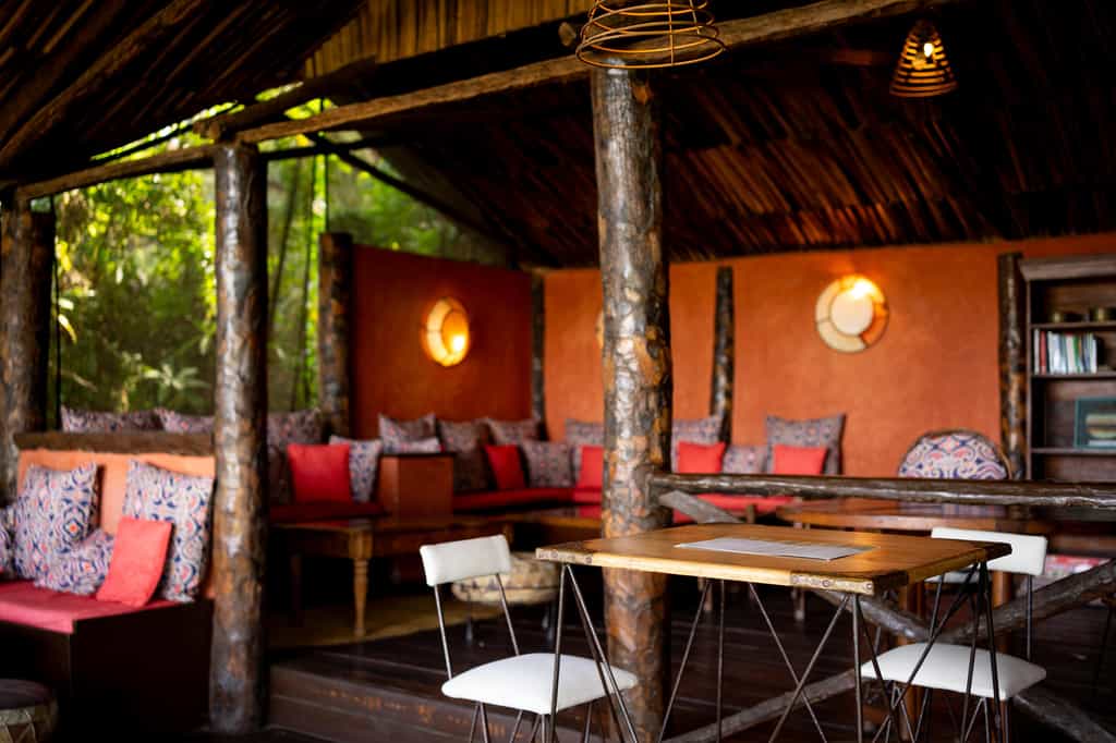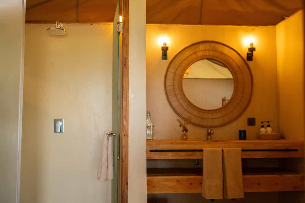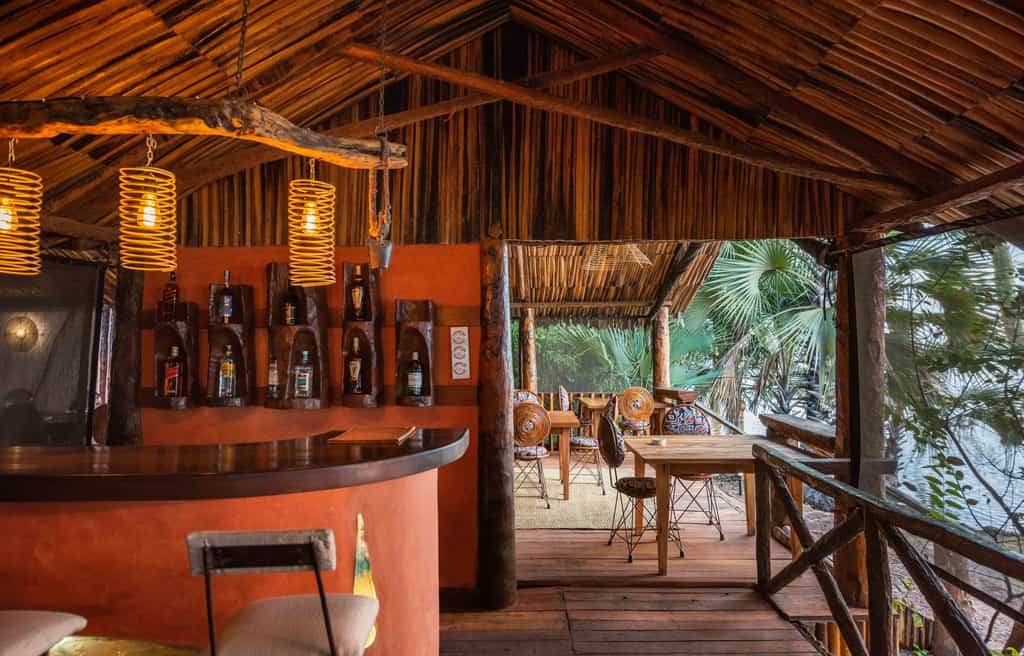 Eight palm-thatched canvas tents on wooden decks blend into the forest. In each, a spacious furnished veranda leads to the bedroom, featuring a king-sized and a single bed, and a comfy armchair. Behind the living area is the en-suite bathroom, with a walk-in shower and a separate loo. Staff will heat water for your shower, and generated electricity lasts through the night. The decor pays tribute to the indigenous people in features such as animal-hide lampshades and handcrafted metal-framed mirrors.