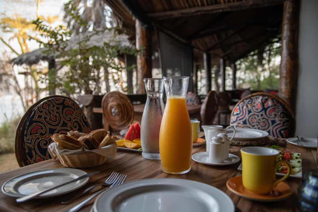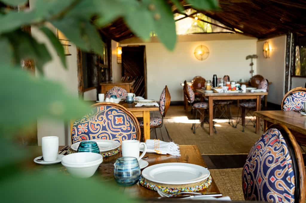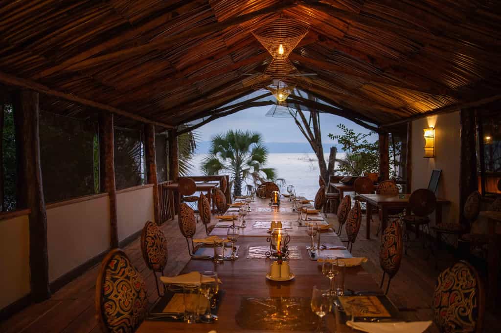 The main area, built with beautiful wooden floors and palm-thatch roofs, consists of an open-sided lounge with cushioned, bench-seated nooks and, separated by the bar, an adjoining dining room. (The cuisine is very good, prepared using local ingredients, and produce made from the camp's own cows). In front, a large grassy clearing opens to a fire pit shaded by fever trees, and a boardwalk leading to the water's edge. The coolest place in camp is the sparkling pool.
