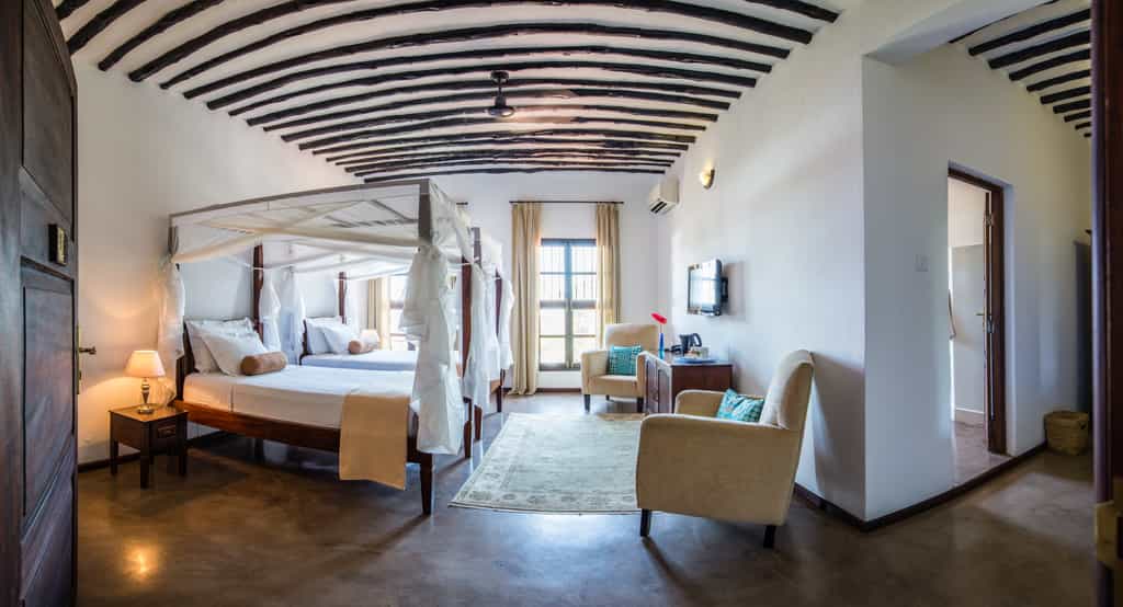 The steep, rather grandly carved wooden staircase leads to nine en-suite rooms, ranging in size from the simple Burdani rooms to the large Sulaima suites. All are beautifully decorated to combine traditional Swahili decor (including brass-studded doors) with the latest in European style. Wooden beams run across the ceilings, plush Persian rugs are scattered around modern desks and lounge chairs. There are no balconies, but most rooms have traditional barred windows that open to reveal views of the streets below.