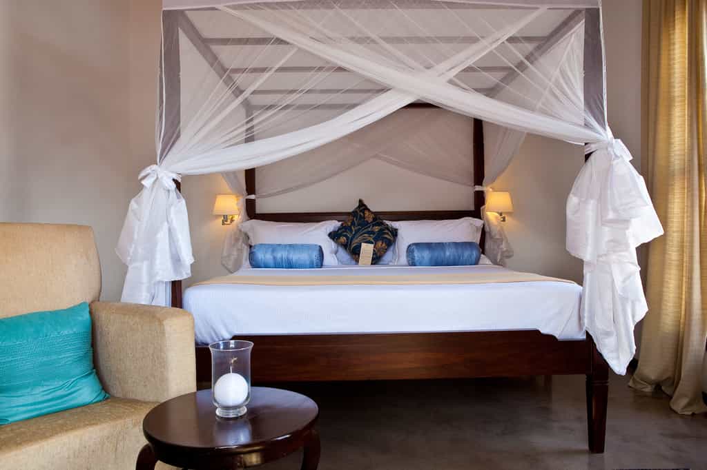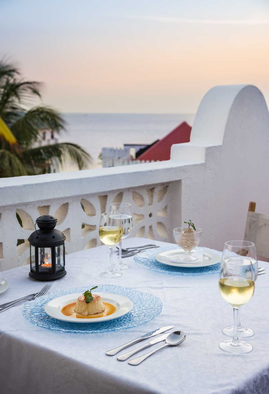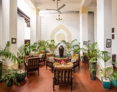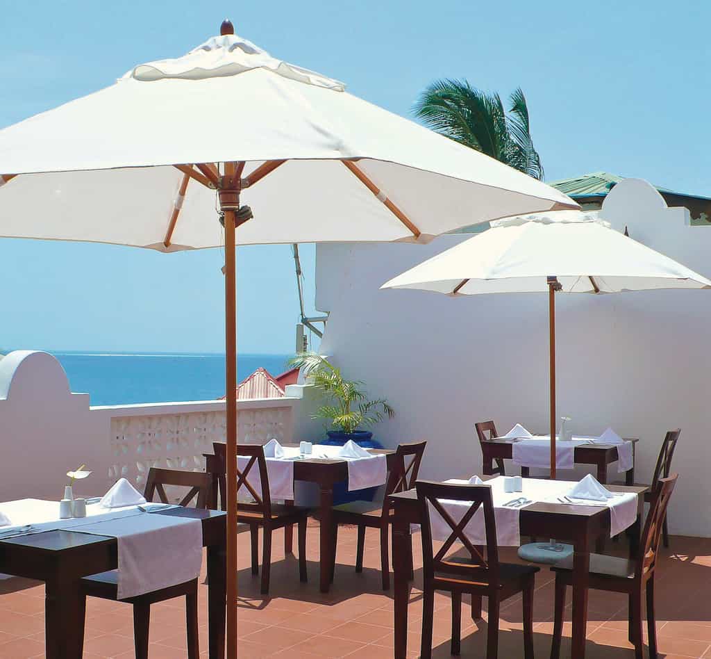 The house was occupied for 170 years by generations of the same family, whose furniture, fixtures and photographs scattered throughout the lounge areas lend a homely Zanzibari charm that combines wealthy Arabic and Swahili style. Rich red-tiled flooring opens to an expansive central lounge area with high wooden ceilings and stairs leading to the rooms and, on the roof, the restaurant. The cuisine is a fusion of traditional and continental specialities, incorporating the island’s aromatic spices. Wi-fi is available throughout as well.