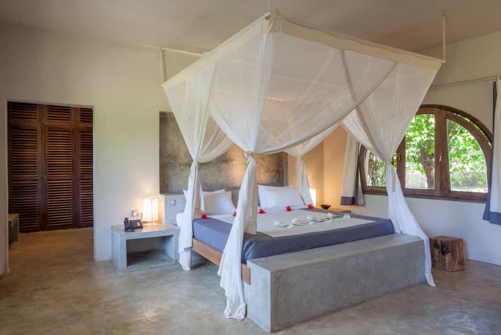 Ocean suites enjoy a front-row sea view, with patios leading to private, bamboo-protected gardens, and suspended daybeds that make midday kips mandatory. Arched windows permit plenty of light, brushed concrete floors keep things cool, and en-suite bathrooms feature floor-to-ceiling, slate-grey brushed concrete and large showers. Garden suites are similar, but have separate living rooms and grand bedrooms with beds on shallow platforms. Villas enjoy all the perks of self-catering – kitchen, two living rooms, three bathrooms and a broad terrace.