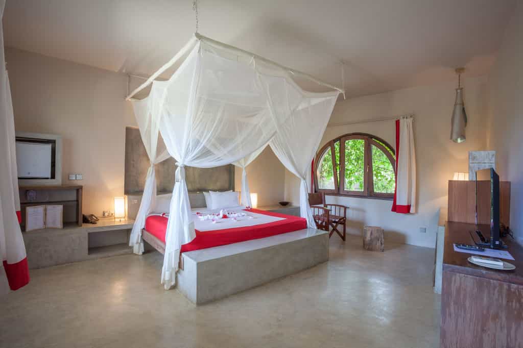 The resort's extensive grounds curve and loop to encompass shady alcoves and hidden nooks. Outdoors, there are places to lounge or dine beneath bamboo pergolas; the C-shaped sofa in the sand is a favourite. There are two pools and plenty of cushioned loungers. Enjoy a meal all day long at the Beach Bar and Restaurant, which serves fresh-caught seafood, fruit and local and international cuisine. The spa has an indoor/outdoor feel to it, overlooking the garden and beach. Bliss out!