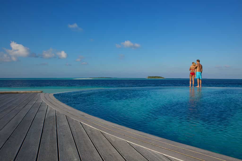 Relaxation is in the air at Komandoo beginning at the Duniye Spa where you can enjoy an array of treatments from Thai to Balinese, including a Maldivian serenity ritual. In true barefoot, island style, the Aqua restaurant is set on stilts over the water, serving surf and turf with a noteworthy selection of wines. Next to the infinity pool (with never-ending views to match), the slick Kandu Bar has evenings of live performances including Maldivian Boduberu music. You can also enjoy sundowners at the Thunder Bar or a barbecue on the beach.