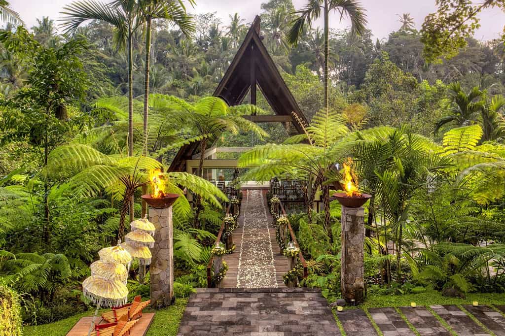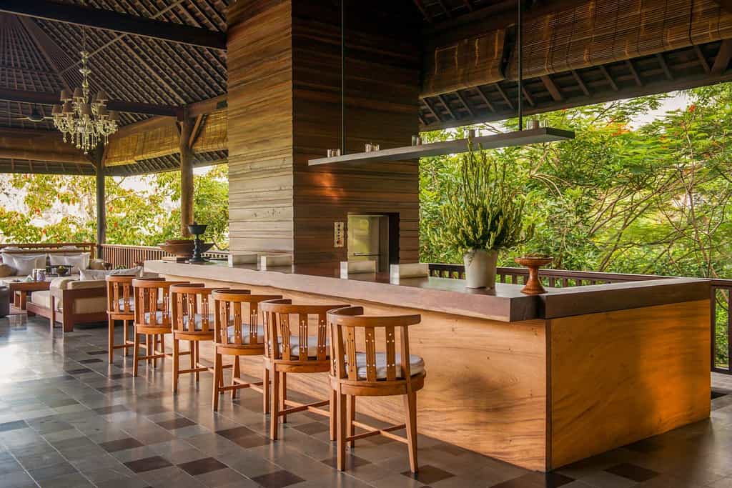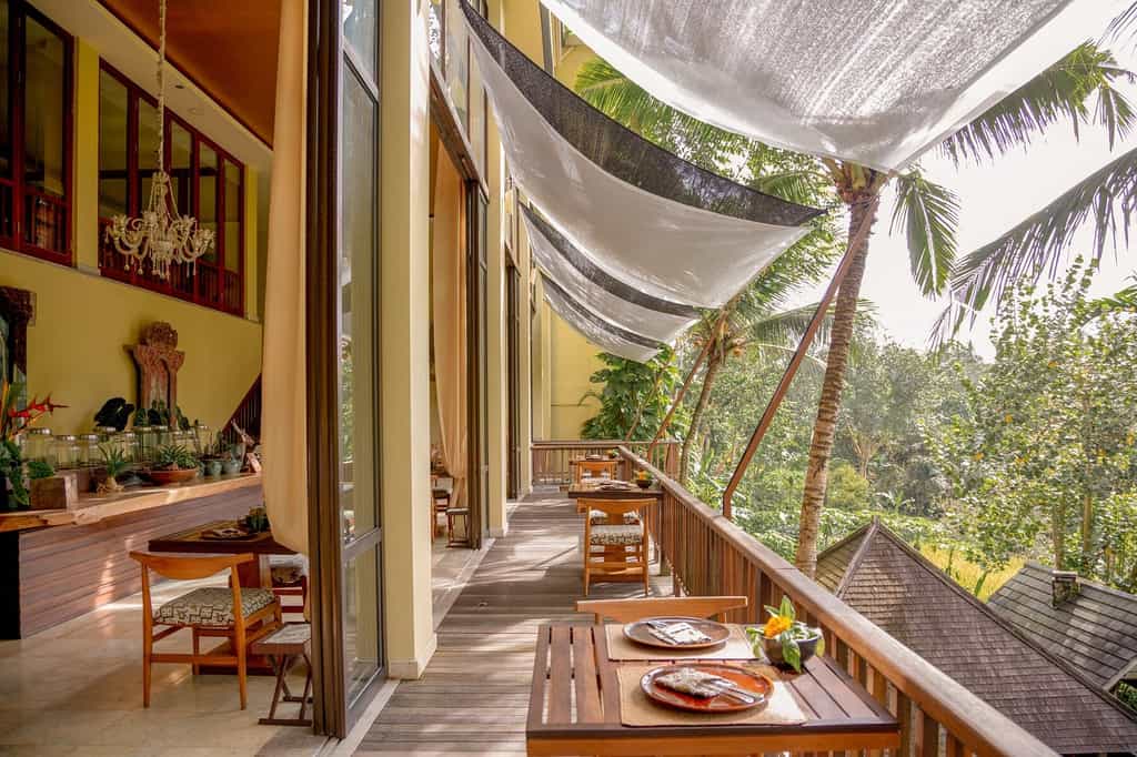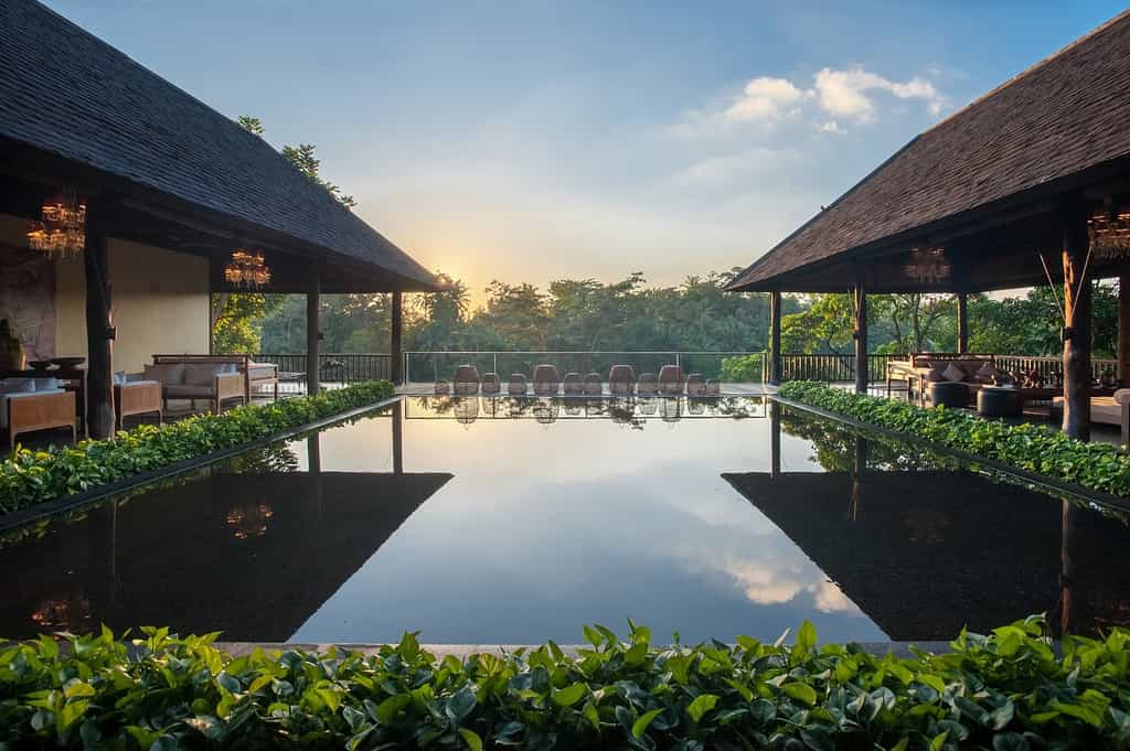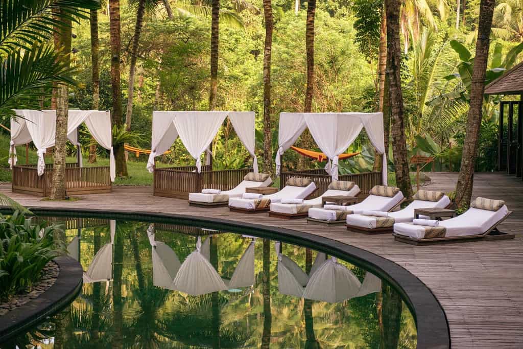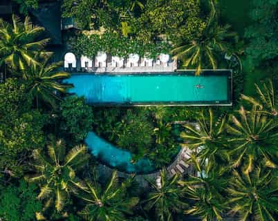 Overlooking dense tropical jungle and shimmering rice paddies, there are 44 suites and villas, all with a fresh, mod aesthetic, marble floors and bathrooms with deep tubs. Each room has a chic living area and spacious balcony, as well as a walk-in closet where a soft cotton tunic hangs. Other thoughtful extras include straw hats and bags and freshly-baked cookies. The largest room type are the villas, which boast their own pool.