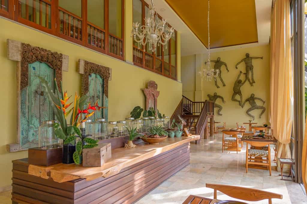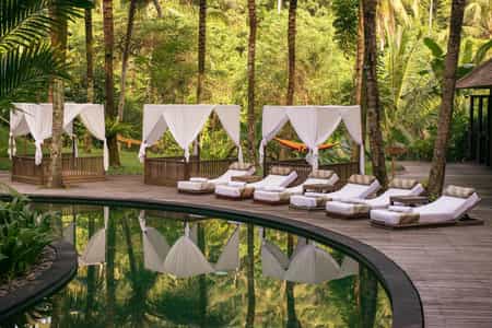 Surrounded by lush greenery, the long infinity pool overlooks the tranquil Campuhan River and is surrounded by plenty of sun loungers to recline upon. Set on the banks of the river, the spa offers a range of heavenly treatments drawing on ancient Indonesian herbal recipes. At mealtimes, the Seneng Kitchen serves a range of international and Indonesian dishes, its walls adorned with unique decor and chandeliers dangling above. There's also a poolside bar where you can grab something chilled to drink or tuck into the complimentary afternoon tea.