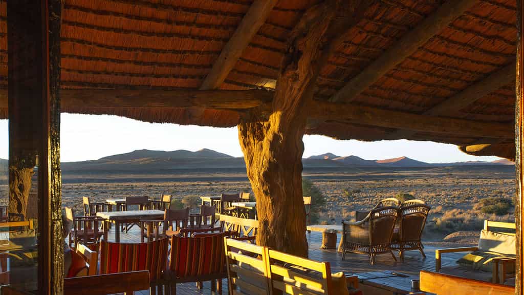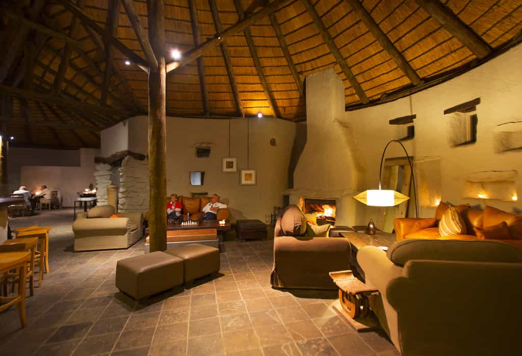 The principal focus of the lodge is to make the most of the view, and to sit comfortably within it. The owners have clearly succeeded. Two adjoining thatched roofs, peaked to resemble dunes, cover the central area. To one side is the kitchen and restaurant, which spills on to a lovely veranda on which dinner is served. To the other is the bar and lounge, with an open fireplace for chilly winter evenings (mid June to August). Outside is a pool where cooling off after an adventure is mandatory.