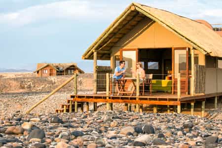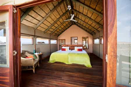 There are 23 chalets or 'kulalas', from the local Oshiwambo word meaning ‘to sleep’. Each is made of canvas, wood and thatch, raised slightly off the ground to allow a through-flow of air. This, along with a ceiling fan, helps to keep the rooms cool in summer (no aircon here, this is an eco-lodge!). Inside are comfortable beds, luscious white linen and bold throws and an en-suite bathroom. Each chalet also has a roof terrace for sleeping out under the stars (not for cold winter nights) and a private deck.
