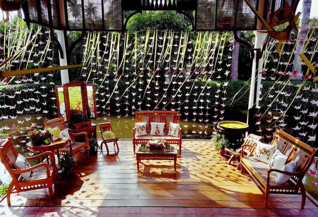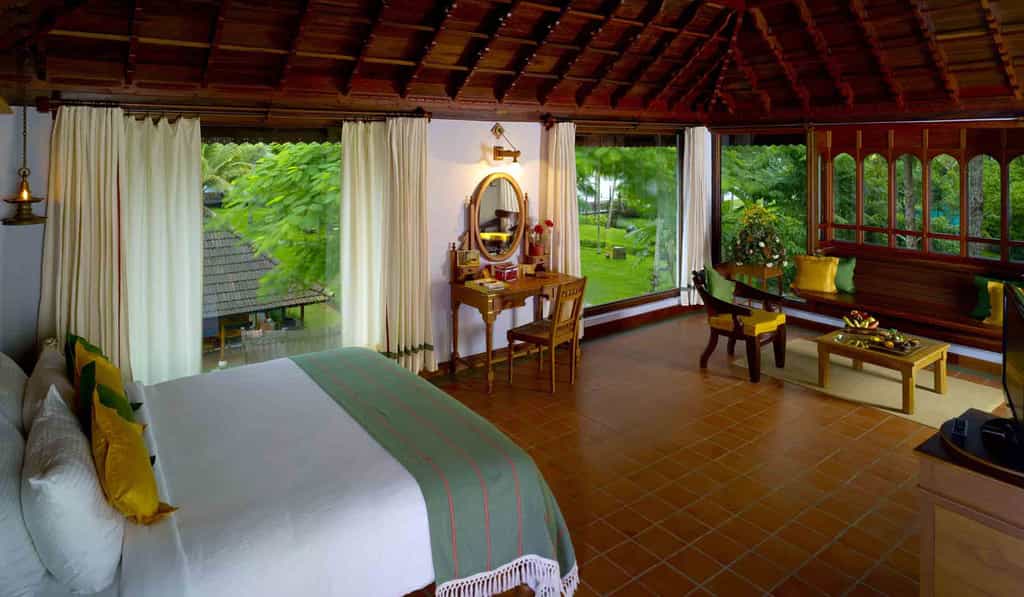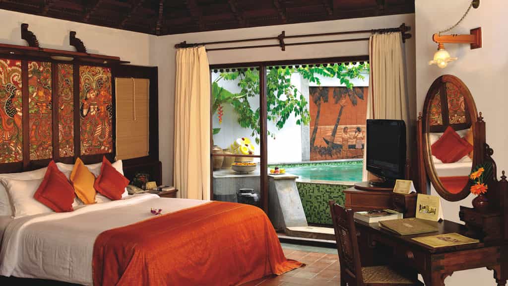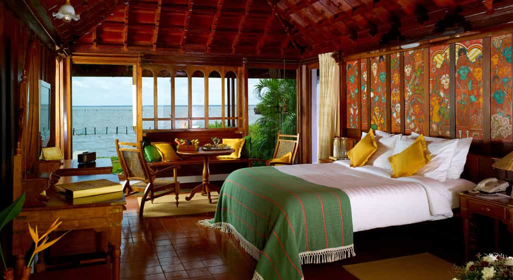 Built in a traditional Keralan style, the rooms have high ceilings, wicker furnishings and colourful murals on the walls. Overlooking the lake, canals covered in lotus blossoms or tucked away amongst the trees, each room/villa comes with air con, tea and coffee facilities, desk and an open-air bathroom. Features differ from suite to suite and include a jacuzzi, plunge pool or private courtyard. The Meandering Pool Villas live up to the name on the edge of a snaking 'canal' pool lined with trees.