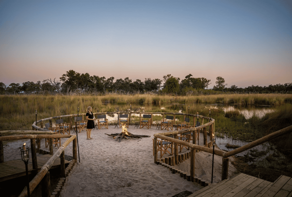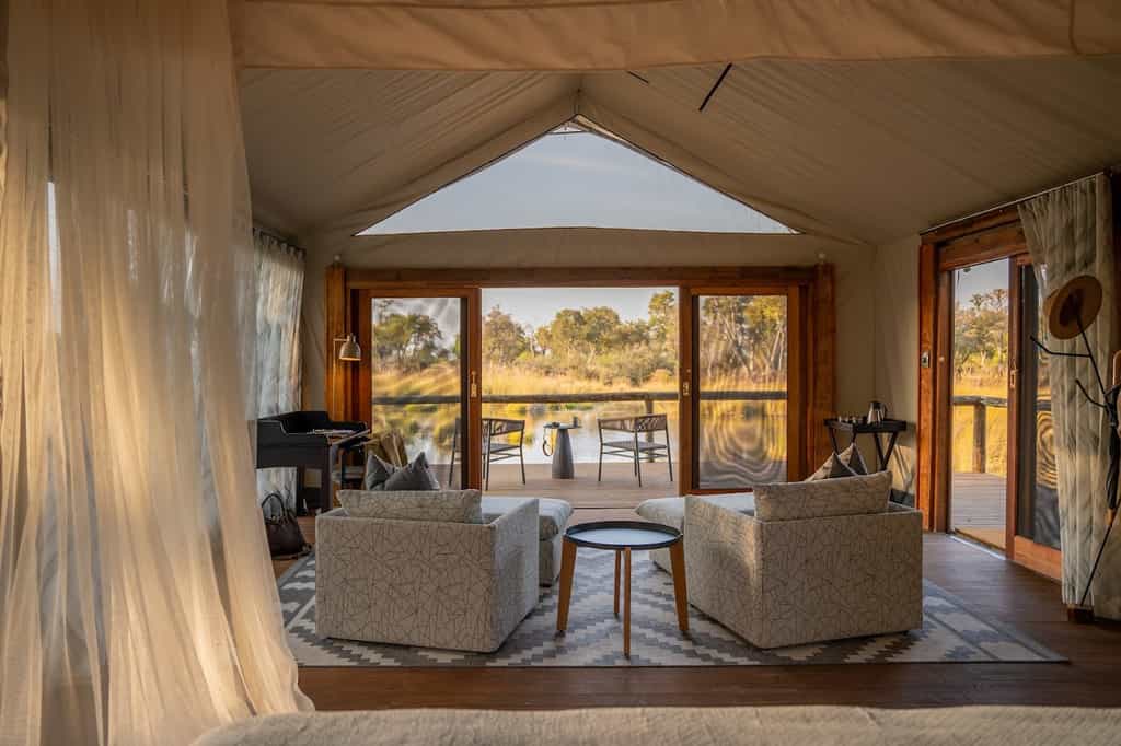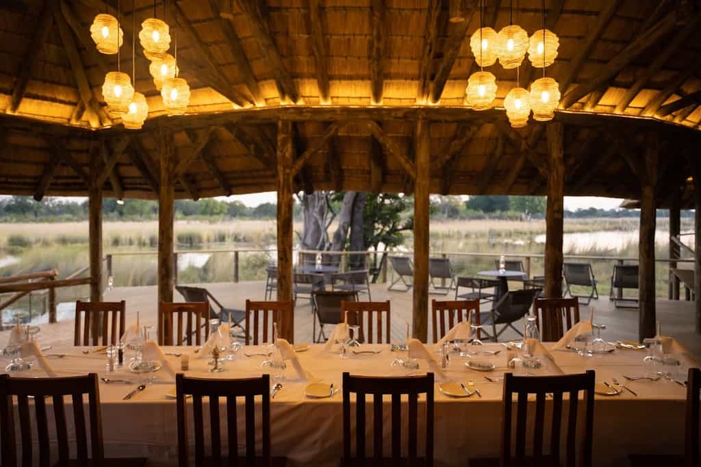 The main camp has the authentic feel of an original safari lodge with high, thatched ceilings, rustic decor and a communal dining table where stories from the day will most definitely be par for the course. A lovely lounge sits just next to the self-serve bar and holds a small collection of books for quiet moments. Leading down to a sandy firepit, the entire structure is 'wall-less' with divine views of the lagoon. Take a wander during your down time, or head to the secluded swimming pool and pull up a lounger with a view.