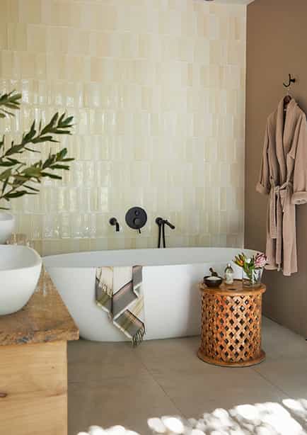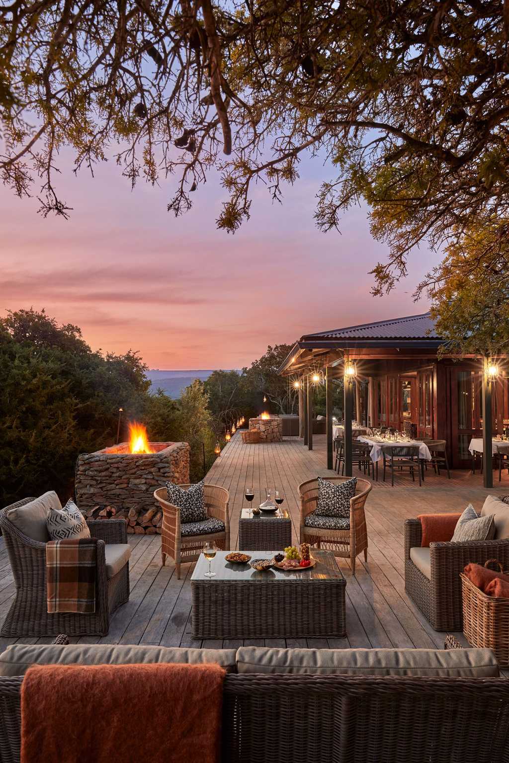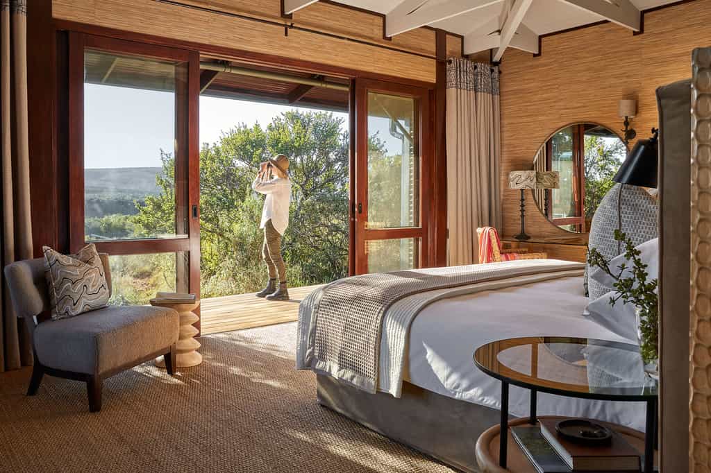 An ultramodern blend of glass, stone and expansive decking (and lots of retro sofas and beanbags), the main area offers jaw-dropping views over the spekboom trees to the glimmering cliffs in the distance. When you’re not distracted by the view, explore the library, art and music collections, play games by the fire or slip into the rim-flow pool to cool off. Meals and mini-bites are served up from the open kitchen whenever and wherever you like and no request is ever too much trouble.
